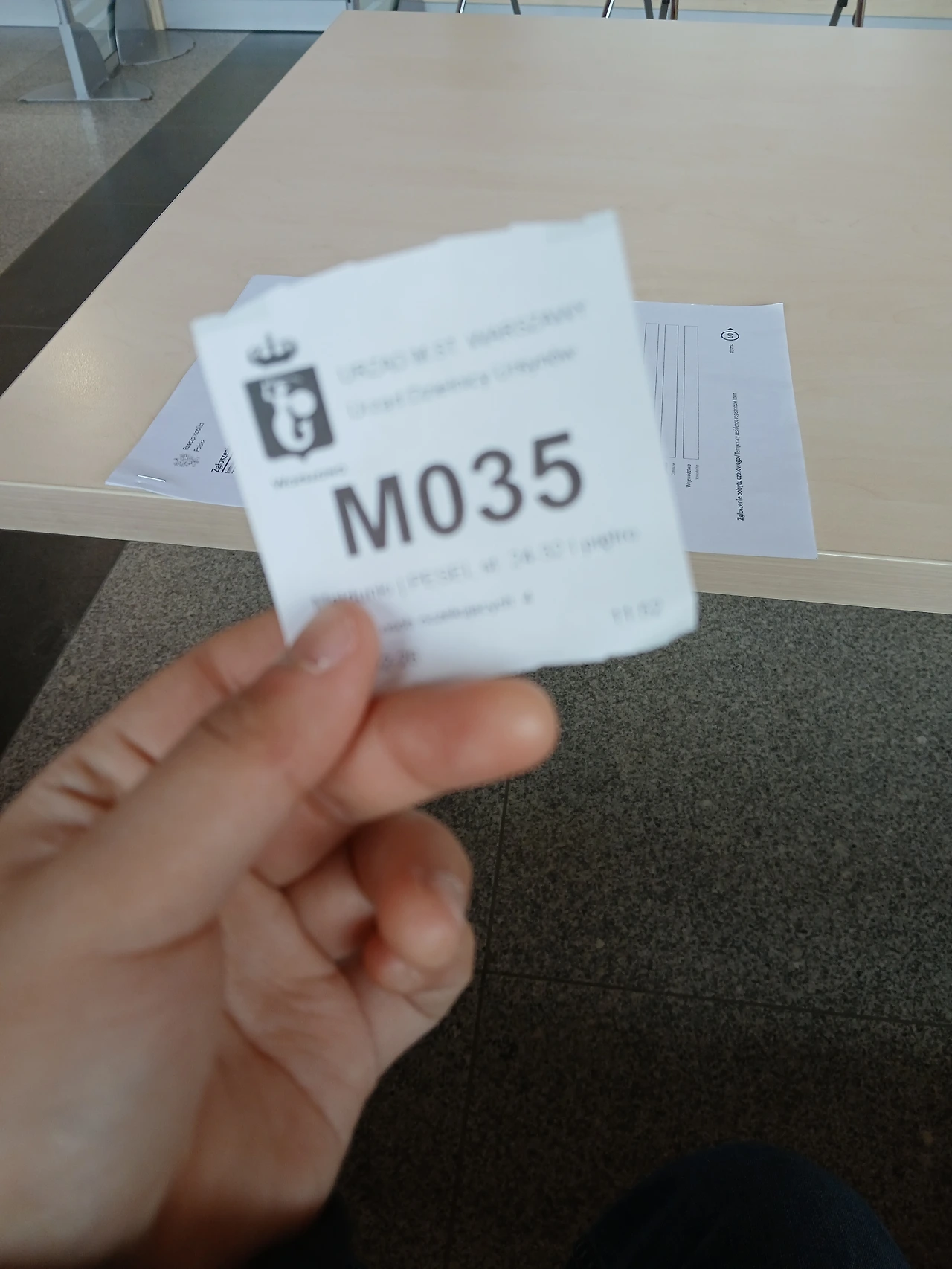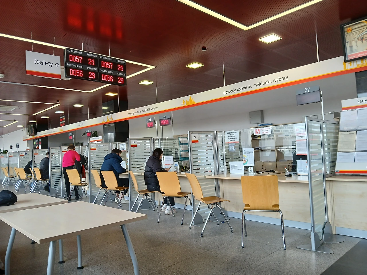 바르샤바 시청의 사진. 오른쪽 사진과 같이 'M' 표시가 있는 번호표가 곧 거주지 등록자를 위한 예약 번호표다.