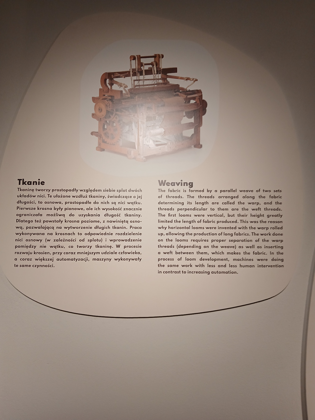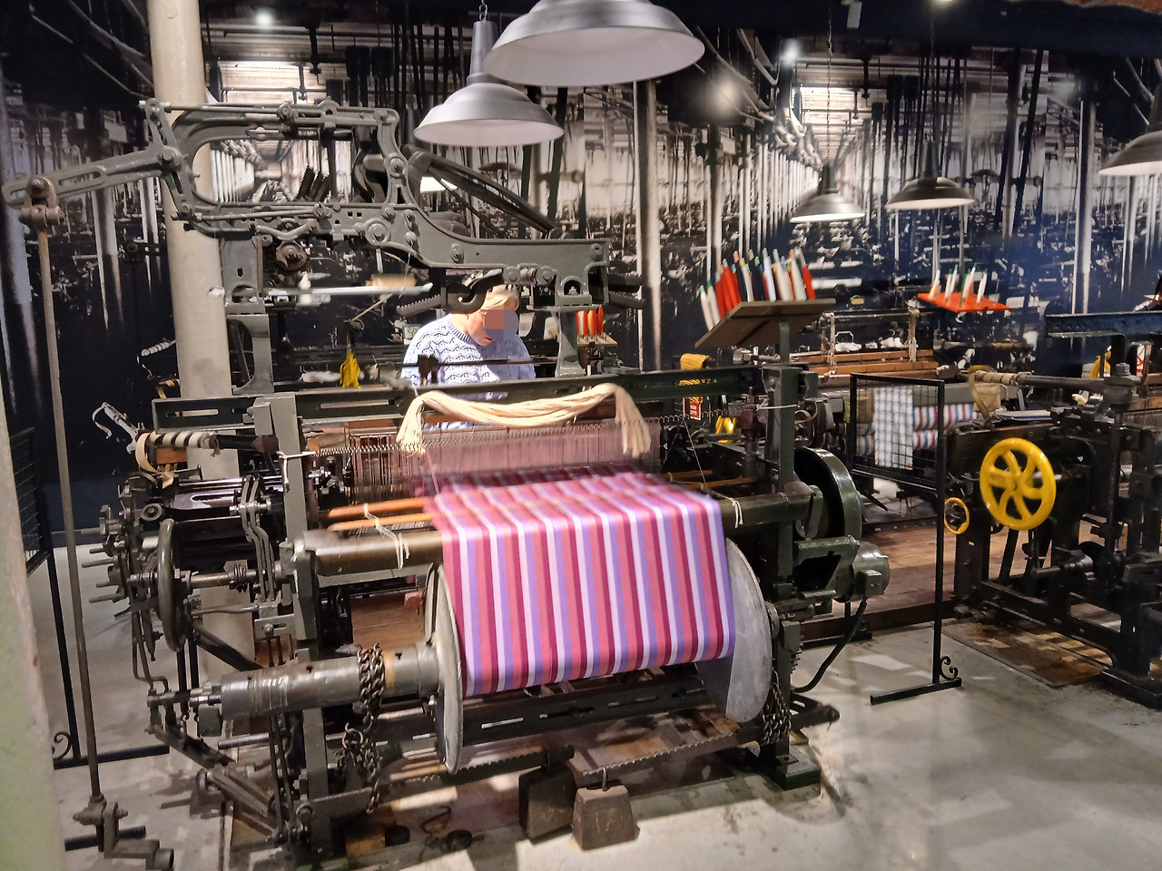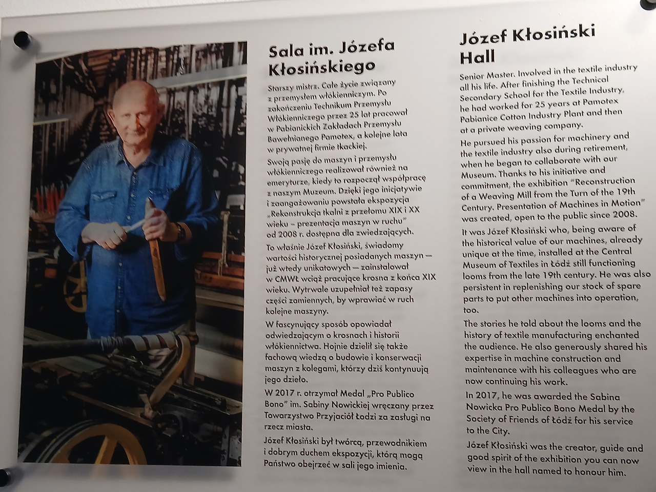 투리가 좀 더 안으로 들어가니, 한 남자가 다른 사람들을 앞에 두고 당시의 기계를 어떻게 활용했는지 몸소 시범을 보이고 있었다. 가이드는 손으로 기계를 조종하면서 바쁘게 관객들에게 설명을 하고 있었으나, 슬프게도 투리는 폴란드어를 못하는지라 그의 말을 단 하나도 이해하지 못했다. 한편 해당 가이드에 대한 배경설명도 한쪽에 걸려 있어서 한 번 찍어봤는데, 내용을 보니 우치의 직물 산업에 대한 열정이 상당하신 분으로 보였다. 이 체험 전시관이 운영될 수 있던 것도 저 가이드 분의 헌신이 있었기 때문이 아닐까 싶다. 영어를 잘하시는 독자 분들은 저 가이드의 이력이 궁금하다면 위의 오른쪽 사진을 참고하면 좋을 것이다.