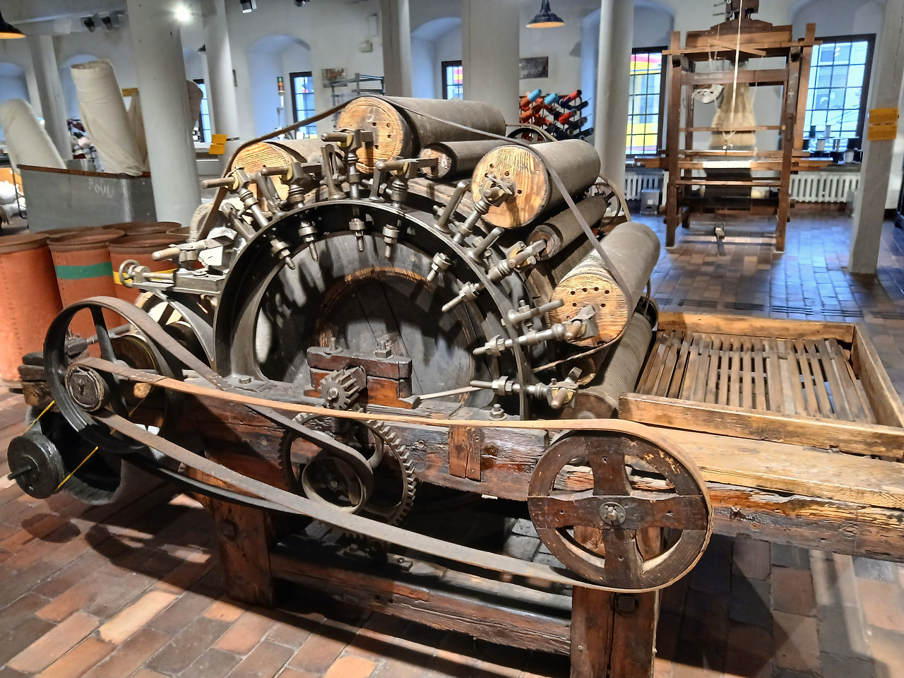 가장 처음으로 들어갔던 실내전시관 구역은 기계 체험실! 해당 박물관은 설립 초기부터 주로 전형적인 공업용 물품들이 수집했으며, 이는 방적, 제직 등 여러 생산 과정에서 사용된 기술적 아이디어와 진보를 보여주는 자료였다고 한다. 특히 우치 지역의 방직 산업에서 만들어진 완전하고 문서화된 기계 세트들은 폴란드 내에서도 큰 규모라고 알려져 있다. 해당 기계들은 교육용으로 전시해 놓았는데, 가이드가 실제로 작동시킬 수 있다고 한다.