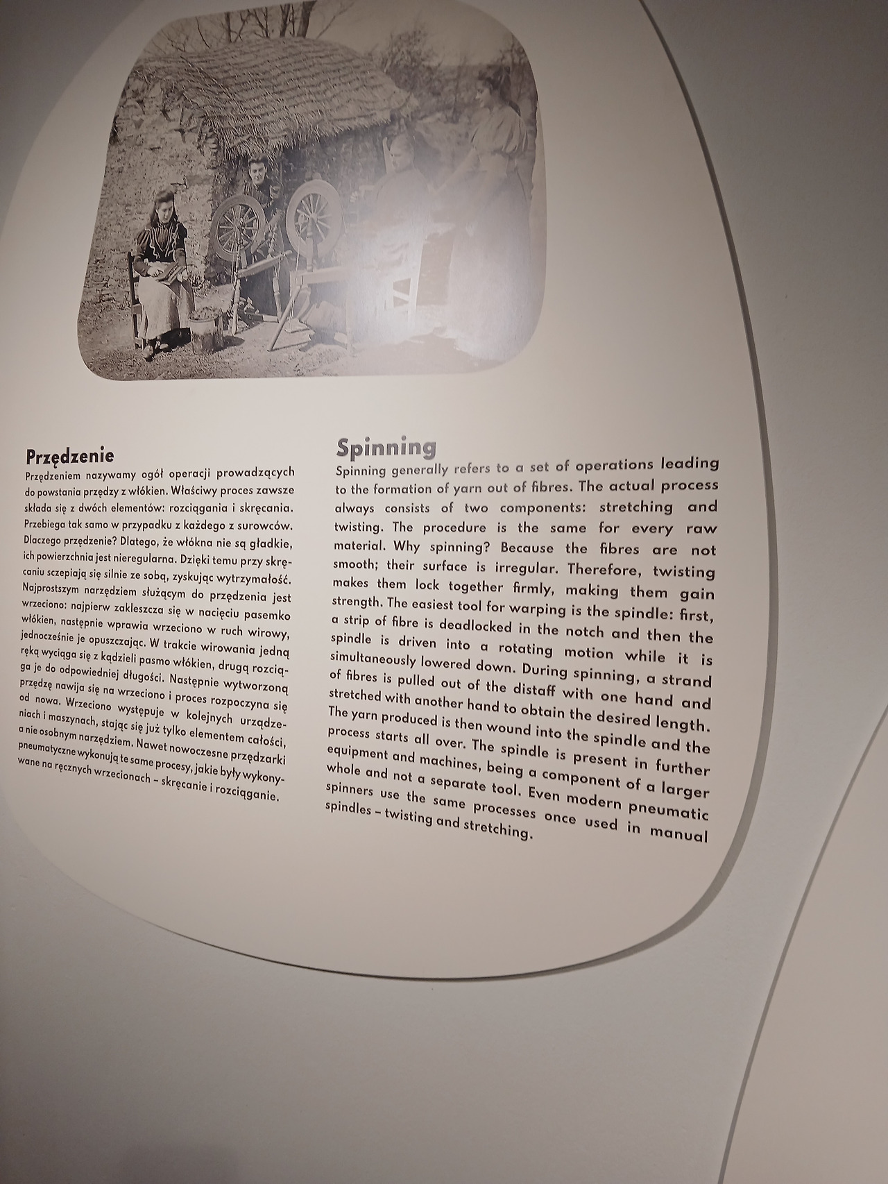 투리는 방직 기술에 대해 아는 것이 없어서 각 기계가 어떤 공정을 맡는 기계인지 몰랐지만, 해당 전시관에서는 크게 방적(spinning), 제직(weaving), 편직(knitting), 마감(finishing)이라는 네 가지 생산 영역으로 나누어 기술의 발전을 소개하고 있었다. 또한 설명서에 의하면 준비 공정(preparatory department)이라 불리는 섬유 생산 초기 단계에 사용된 기계들도 일부 전시관에 포함시켰다고 한다. 투리 눈에는 다 비슷비슷해 보였던 기계들이 자세히 보니 일정한 역할에 따라 여러 갈래로 세분화되어 있었던 것이다.