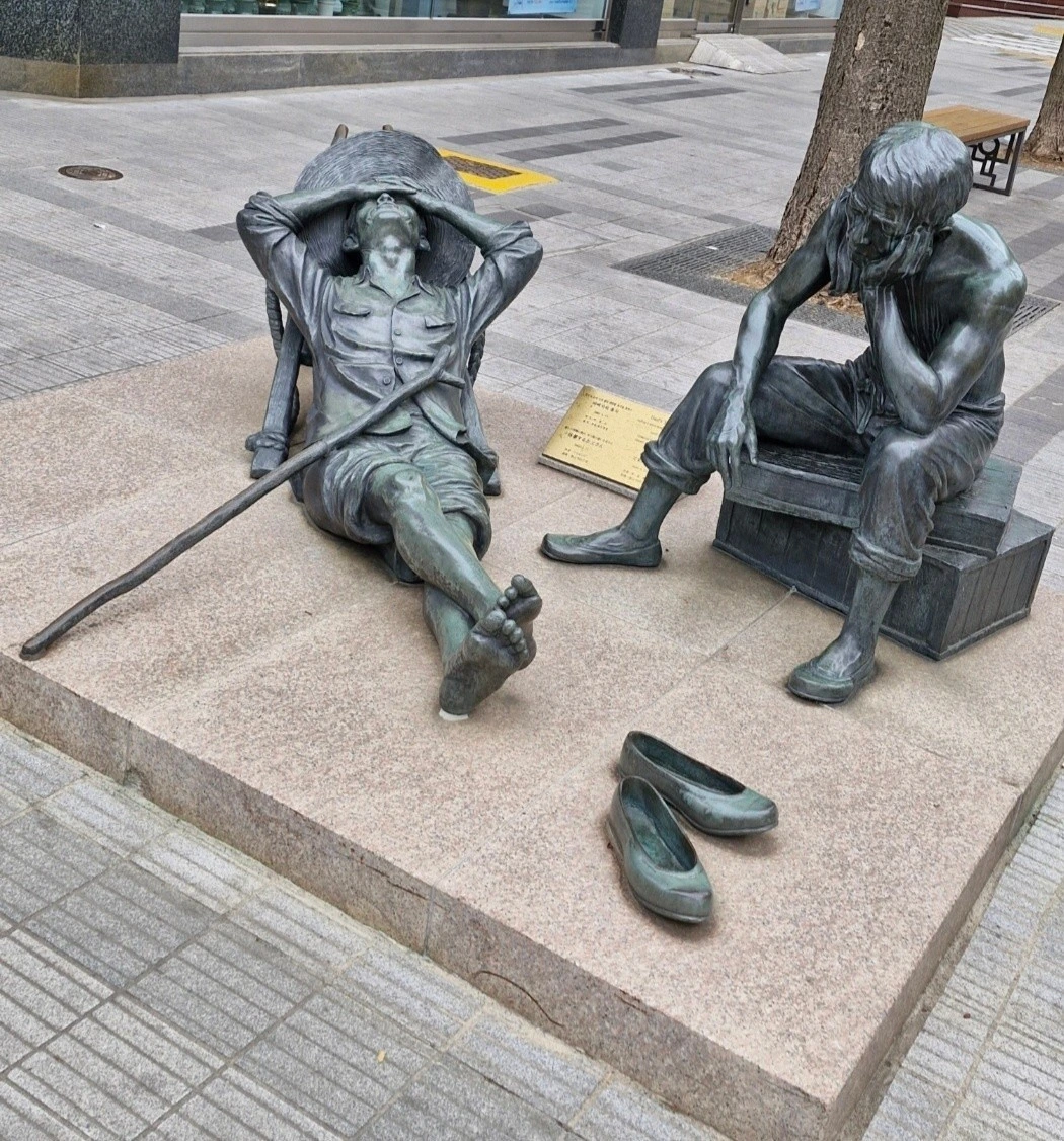 *고단한 노동 후에 잠시 지게 위에 등을 붙이고 쉬고 있는, 편안하게 발을 뻗고 눈을 붙이며 휴식을 취하고 있는 부자상(父子像) 조형물