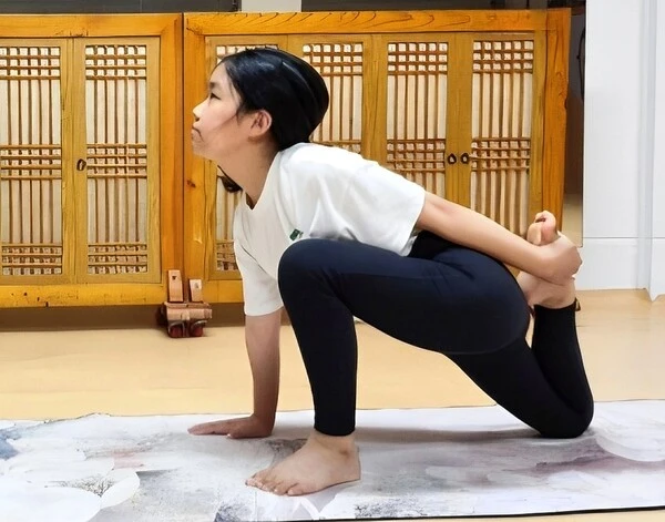 앞에 다리는 굽혀서 상체 옆에 붙이고, 뒤에 있는 다리는 무릎을 바닥에 대고 하거나 쭉 편 채 자세를 유지한다. 팔꿈치를 바닥에 대거나 손을 짚고 할 수도 있다.