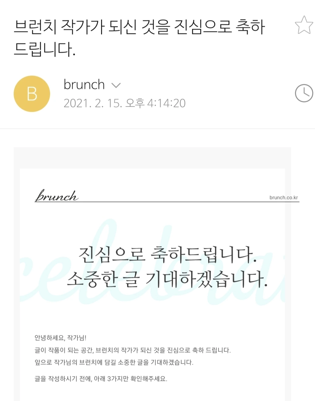 '브런치' 작가로 선정될 것이라고는 거의 기대하지 않았다. 흘끔흘끔 간혹, 괜히 보는 것조차 '감히 내가 읽을 자격이라도 될까?' 싶게 쪼그라든 마음은 언감생심이었다. 그런데... 어쩌다 보니 황송하게도 한 번에 관문을 통과할 수 있었다. 2021년 2월 15일, '브런치' 작가로 선정되었다는 알림 메일을 열던 순간의 설렘과 기쁨은 앞으로도 잊지 못할 것 같다. 그때의 유치하고도 묘한 흥분은 여기에 남겨 두었다.
