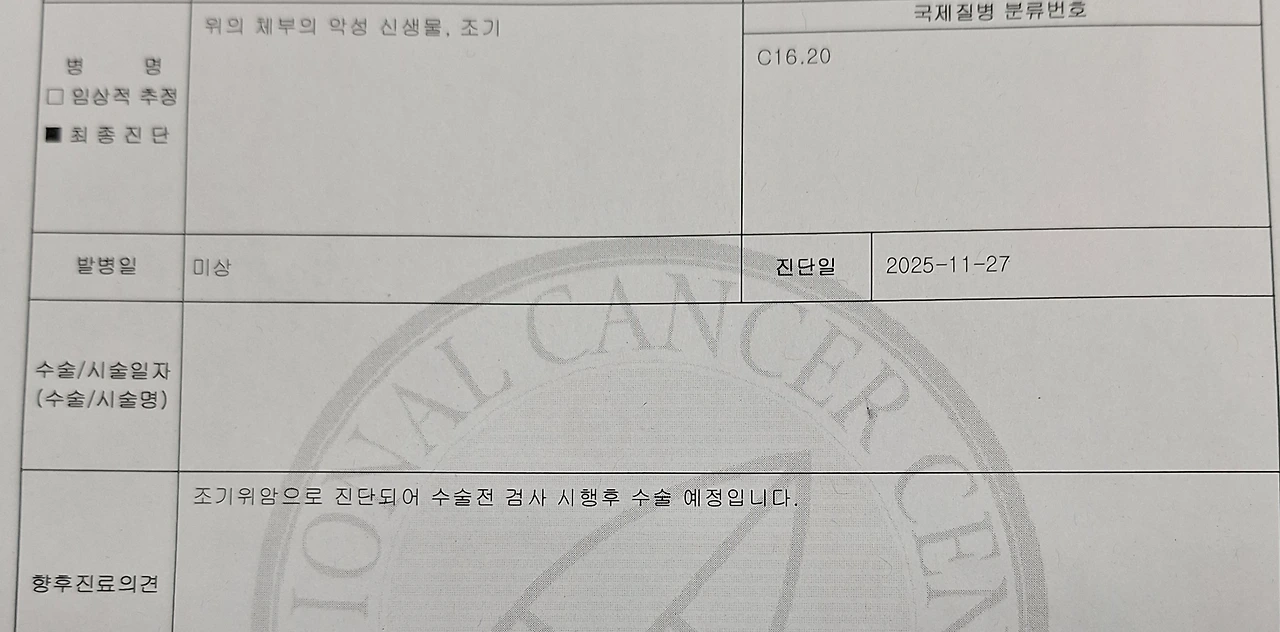 수술 날짜를 정하면서, 현재 상태에 대한 최종 판정을 받았습니다. (어디까지나 뱃속을 직접 들여다 보기 전인 '현재'의 판정일 뿐 수술 후 조직검사에서 더 나쁠 진단 가능성은 열려 있고)