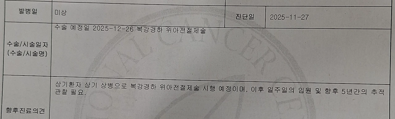 위암 1기. 그런데, 위치가 좋지 않고, 암세포도 독한 종류. 그래서, 복강경으로 위의 2/3를 절제하는 수술을 12월 26일에 실시합니다.