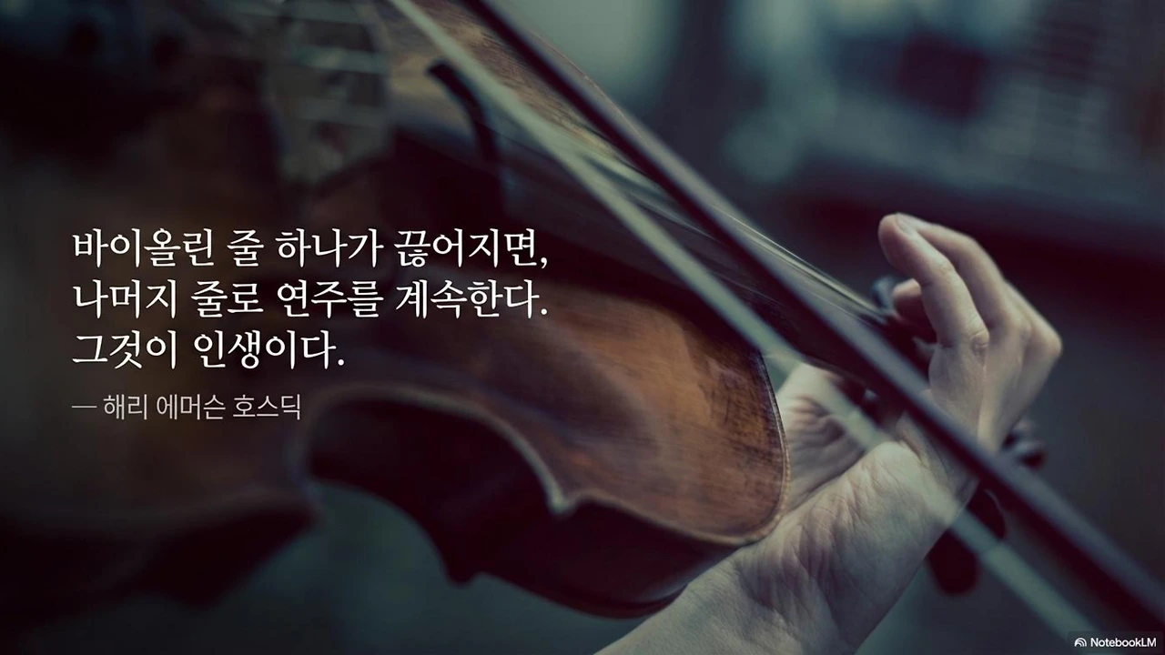 주인공 첼리스트가 중요한 무대에서 연주하던 중 줄 하나가 끊어진다. 그 찰나, 그녀는 당황하고 포기를 생각했지만... 결국 남은 줄로 연주를 성공적으로 마친다. 그 장면은 강렬한 낙인처럼 내 마음 깊은 곳에 남았다.
