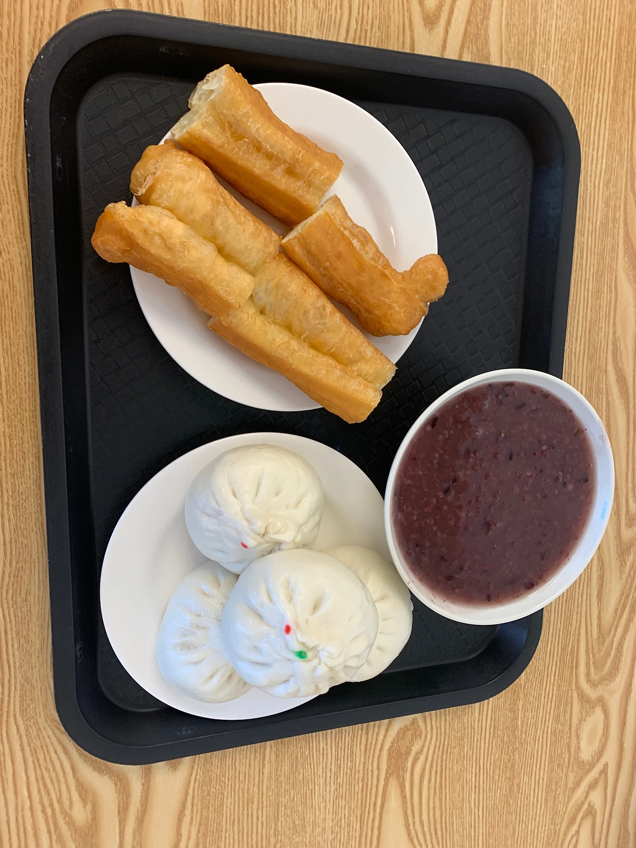 고기 찐빵과 콘지 ( 중국식 죽)와 중국식 꽈배기( 유타오 ) 중국사람들이 아침에 두유랑 같이 먹는 긴 꽈배기 모양이다.