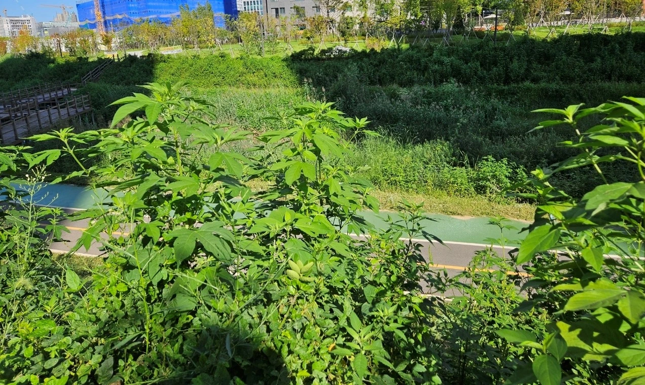 신도시 아파트단지 산책로에서 좀 더 내려가면 하천 산책로까지 이어진다. 잘 정돈된 신도시와는 달리 아직 제초작업을 안 했는지 하천변은 엄청난 야생이다. 여름 내내 온 비와, 내리쬔 강한 햇살에 잡초들은 성인 키만큼 자라 있다.