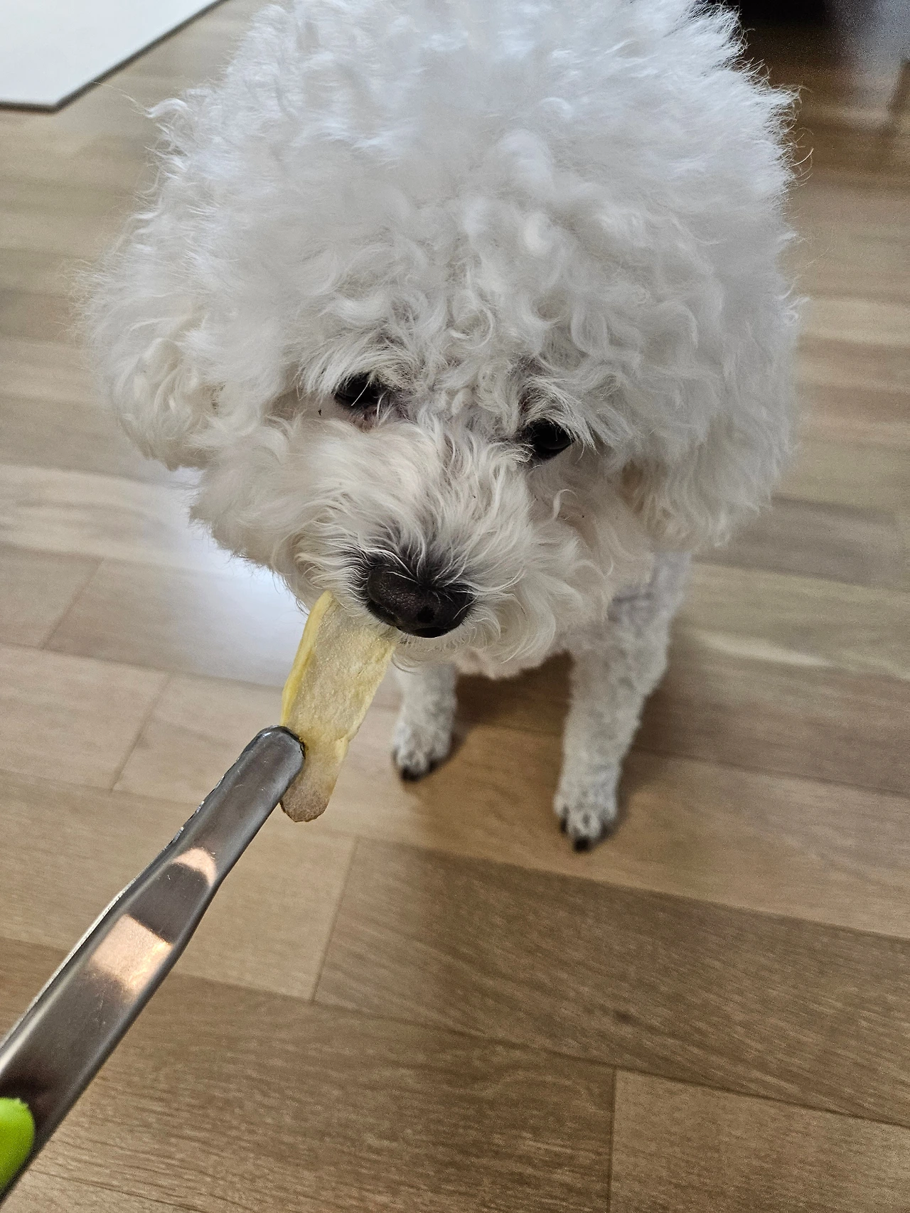 아기강아지 시절, 삶은 고구마를 그냥 줬더니 똥폭탄을 선사해서 삶은 고구마는 줄 수가 없다. 수분 가득한 고구마가 배변양을 많아지게 하고 물러지게 하는 것 같았다.