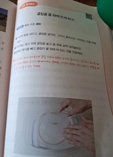 클립을 물 위에 뜨게 하는 실험도 아주 흥미롭다. 수조의 물에 클립을 놓으면 가라앉지만 휴지에 클립을 놓고 물 위에 띄우면 휴지를 빼내도 클립이 물에 떠 있다. 클립의 가운데 부분의 공기가 튜브의 공기주머니 역할을 한다니 퍽 놀랍다.