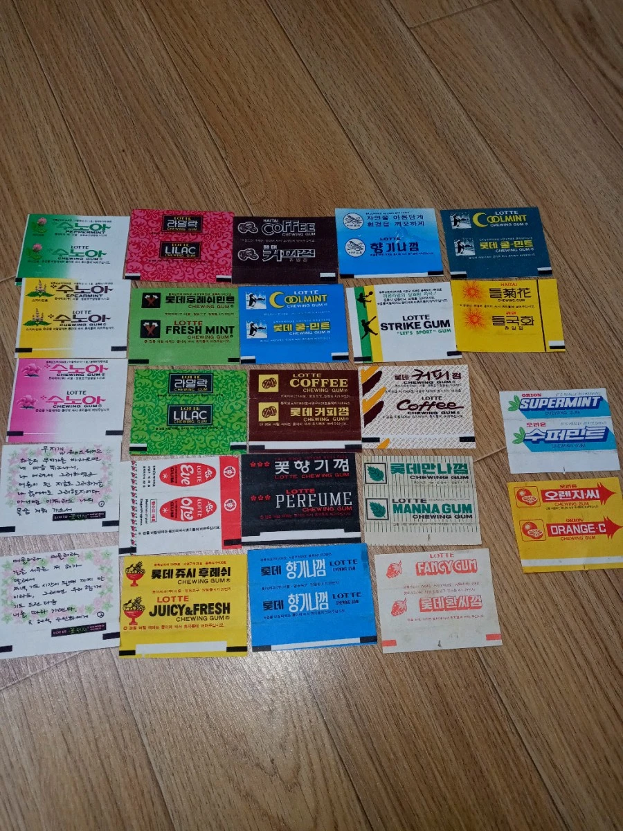 무슨 연유로 내가 껌종이를 모았는지 모르겠지만 지금 우리 집 장롱에는 어렸을 때 모았던 껌종이가 한 움큼 있다. 박물관에 가야 볼 수 있는 것들이다. 사진 넣었던 후지필름이라 쓰여있는 비닐봉지에 소중하게 넣어져 있다. 펼쳐놓고 사진으로 찍어 추억을 소환해본다.