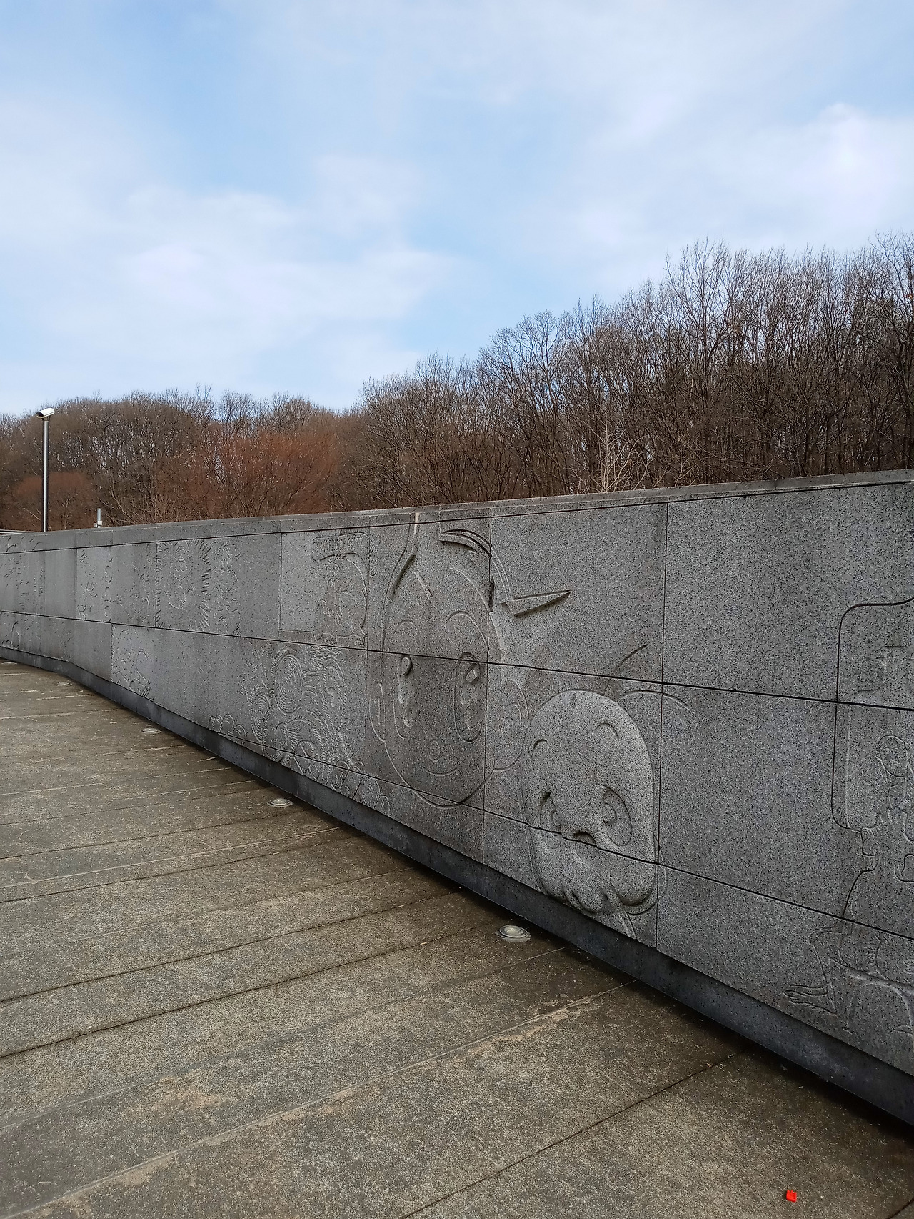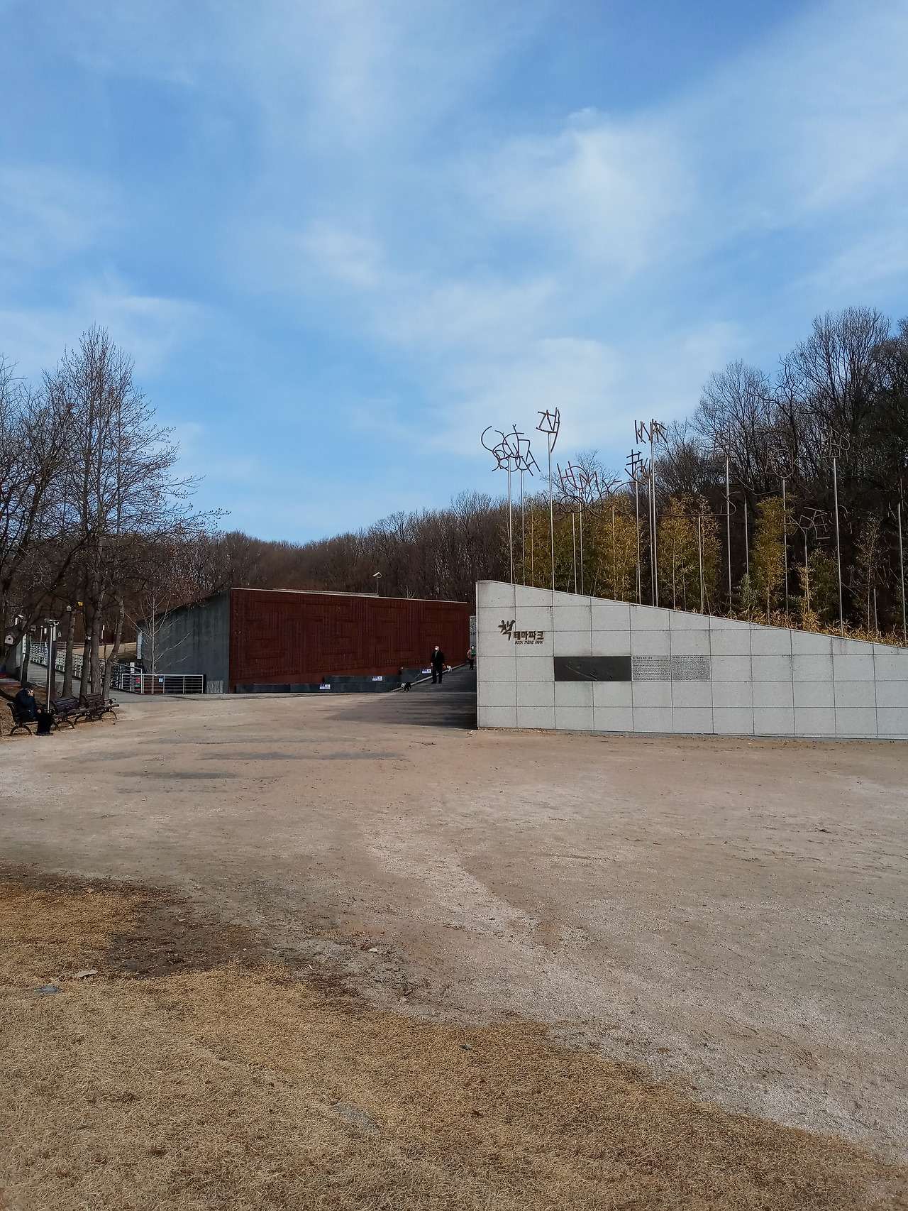 조각품을 감상하고 옆쪽으로 가니 책 테마파크가 나온다. 책의 역사가 그려진 벽이 있어 산책하듯 이야기를 나누며 빙글빙글 돌아 걸었다. 한쪽 벽에 숨어있다 걸어오는 친구 두 명을 깜짝 놀라게 해 주었다. 하하 호호 웃으며 아래로 내려와 열 체크 등을 하고 건물 안으로 들어가 본다. 예전에 가족과 함께 온 곳이지만 다시 가니 새롭다. 책과 함께 체험공간도 있어 좋은 곳이다. 책을 주제로 산책코스가 있으며 미술 전시가 있고 책을 읽을 수도 있는 곳이다. 신간 코너도 있고 조용히 앉아서 책을 볼 수 있는 공간이 넓어 좋지만 우리는 휘리릭 한 바퀴 둘러보고 산으로 향했다.