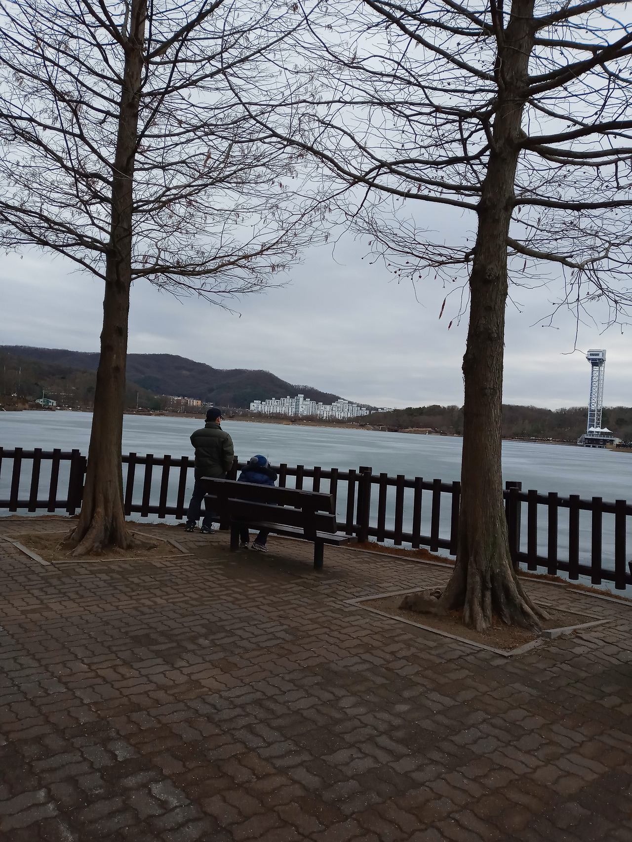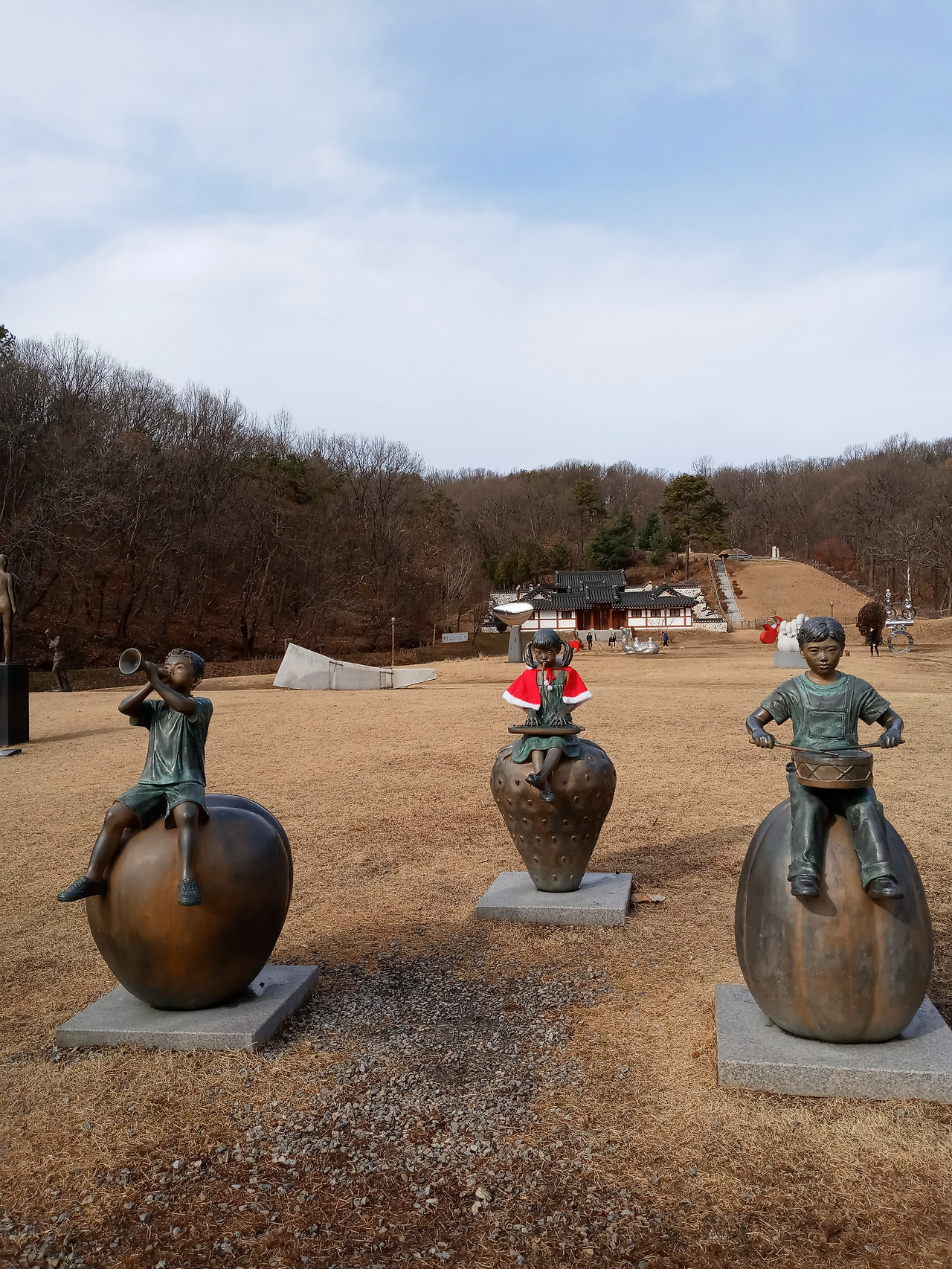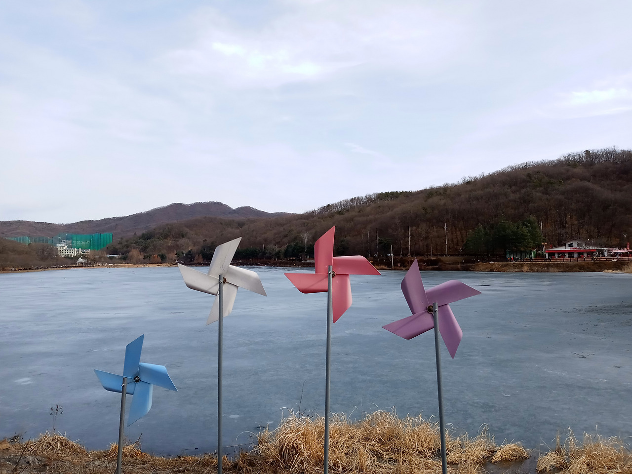 호수는 꽁꽁 얼어있었지만 번지점프를 하는 곳에 가니 호숫가에는 물이 얼지 않아 청둥오리들이 가족회의를 하는지 삼삼오오 모여 머리를 맞대고 있다. 위쪽으로 걸어가니 조각 공원이 나오고 '산바람 강바람'의 작곡가 박태환 노래비가 있다. '숲 속의 합창단'이라는 조각품을 보니 초등학교 다닐 때 사용한 작은북, 멜로디언, 나팔이 보인다. 꼭 우리 시골 아이 세 명의 어릴 때 모습을 보는 것 같이 촌스러우면서 정겨워 웃음이 나왔다.