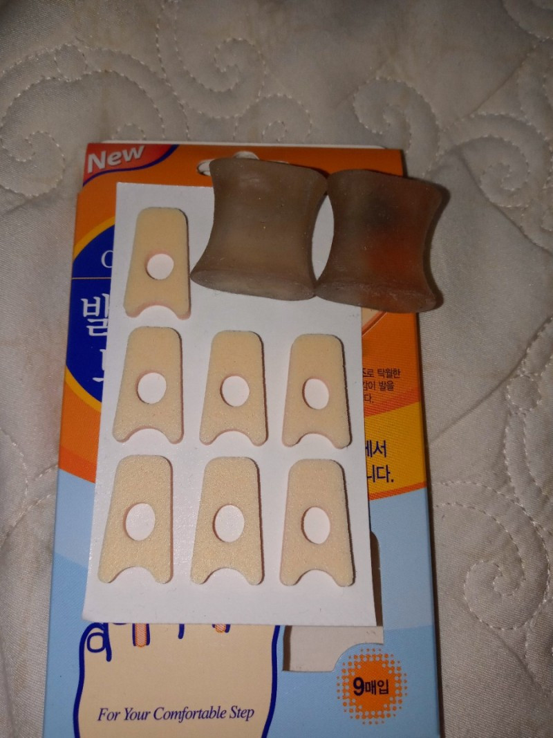 무지 외반증은 유전이 원인인 경우와 후천적 원인이 있다는 것을 알았다. 큰언니의 발 모양이 생각났다. 언니 발의 변형이 아주 심한 것으로 보아 나는 선천적인 원인에 무게를 두었다. 또 폐경기 여성에게 나타난다는 말에 그동안 잘 지내오다 갱년기를 맞아 유독 심해졌다는 것에 마음을 두었다. 치료 방법은 딱히 없고 수술로만 가능하다고 했다. 인터넷에는 여러 기구들을 판매하고 있었다. 그것들로 특별히 효험을 봤다는 기사는 없었지만 남편 수술할 때 간 큰 병원 근처에서 의료 기구 파는 곳에 들러 하얗고 파란색의 교정기를 샀다. 또 실리콘으로 만들어진 것도 사서 발가락 사이에 끼우고 걸어 다녔다. 볼이 넓고 굽이 낮은 신발을 신어야 한다고 했는데 결혼한 이후 편한 신발만 고집한 나는 그 이유가 아님을 스스로 잘 알고 있다. 요즘은 실리콘도 아파서 빼고 티눈 보호대를 사서 새끼발가락 사이에 끼고 등산화나 운동화를 신고 걸어 다닌다.