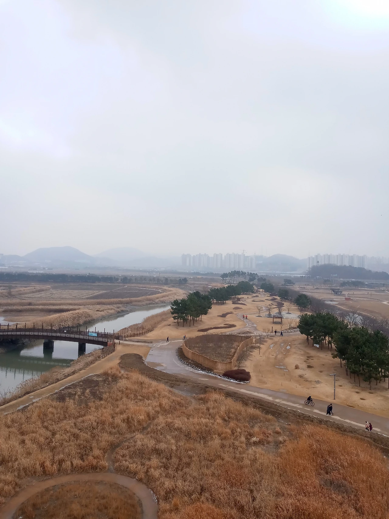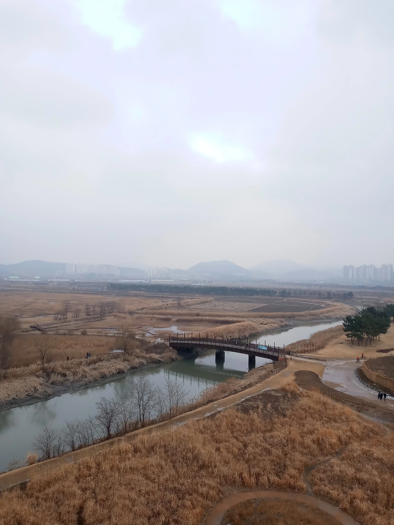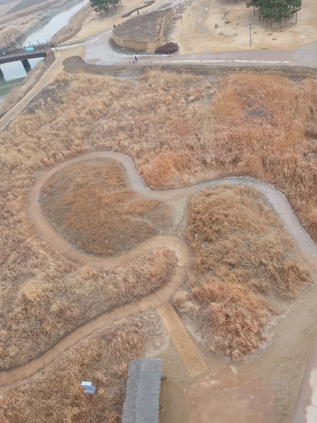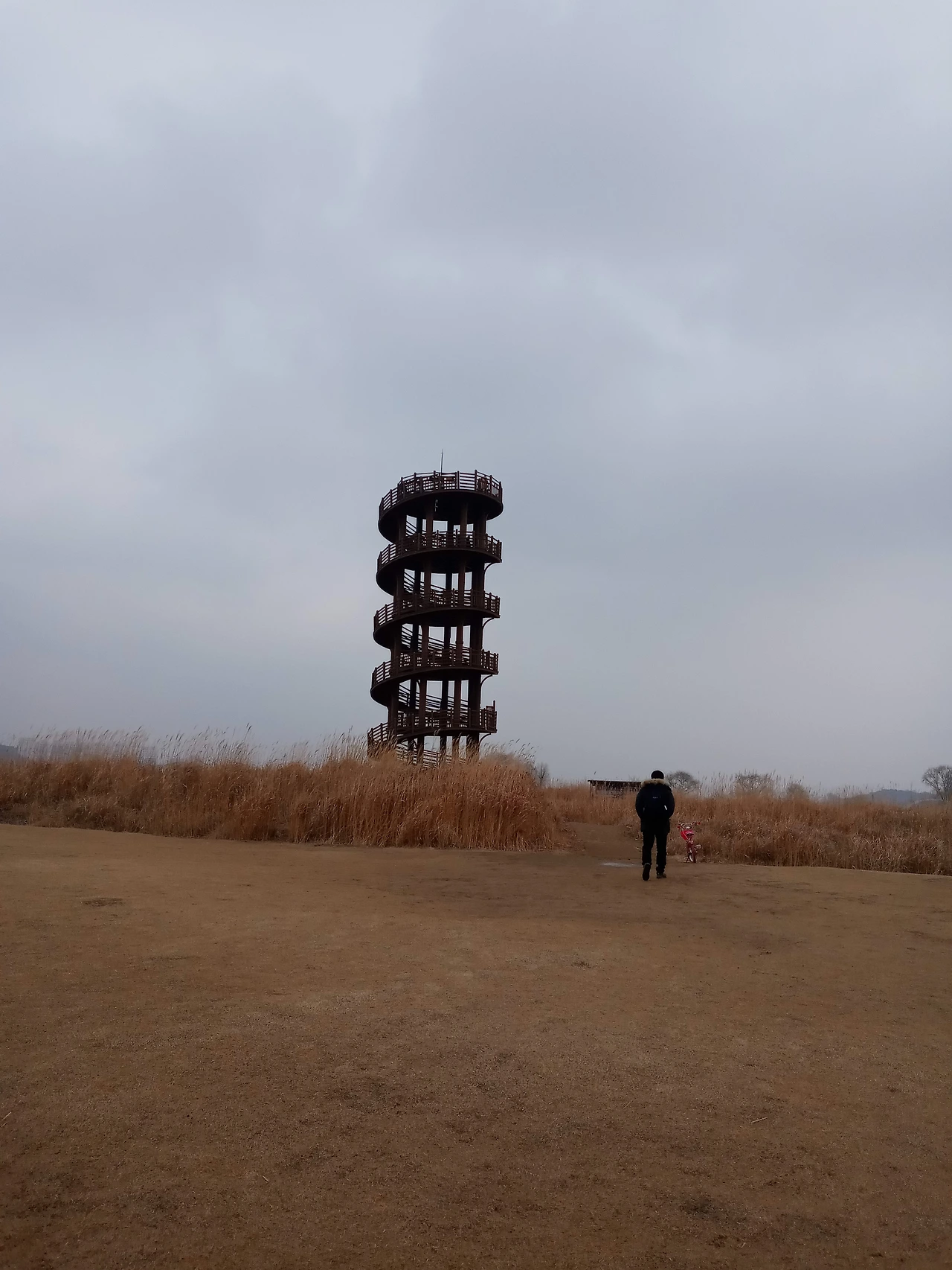 나무로 만든 6층 흔들 전망대는 바람이 부니까 더 심하게 요동친다. 전망대 꼭대기에서 바라보는 시흥갯골생태공원의 전체 모습이 참 멋지다. 억새밭의 황토색 물결이 예쁘고 구불구불 길이 뱀처럼 조화를 부리고 있어 멋있다. 만조로 갯골에는 물이 많아 청둥오리가 짝을 지어 둥둥 떠다니며 사랑을 속삭인다. 그들을 보고 서울 사는 친구가