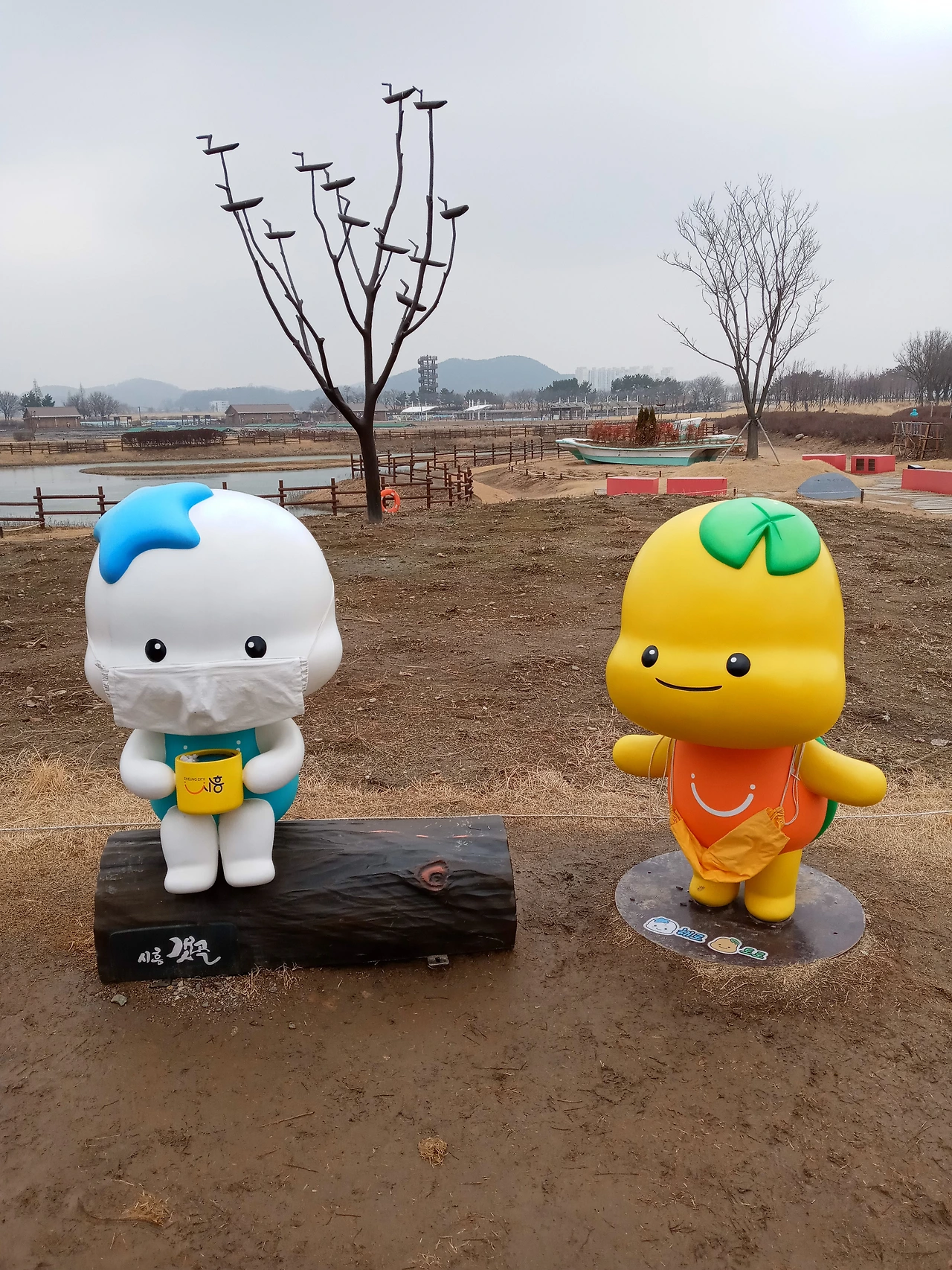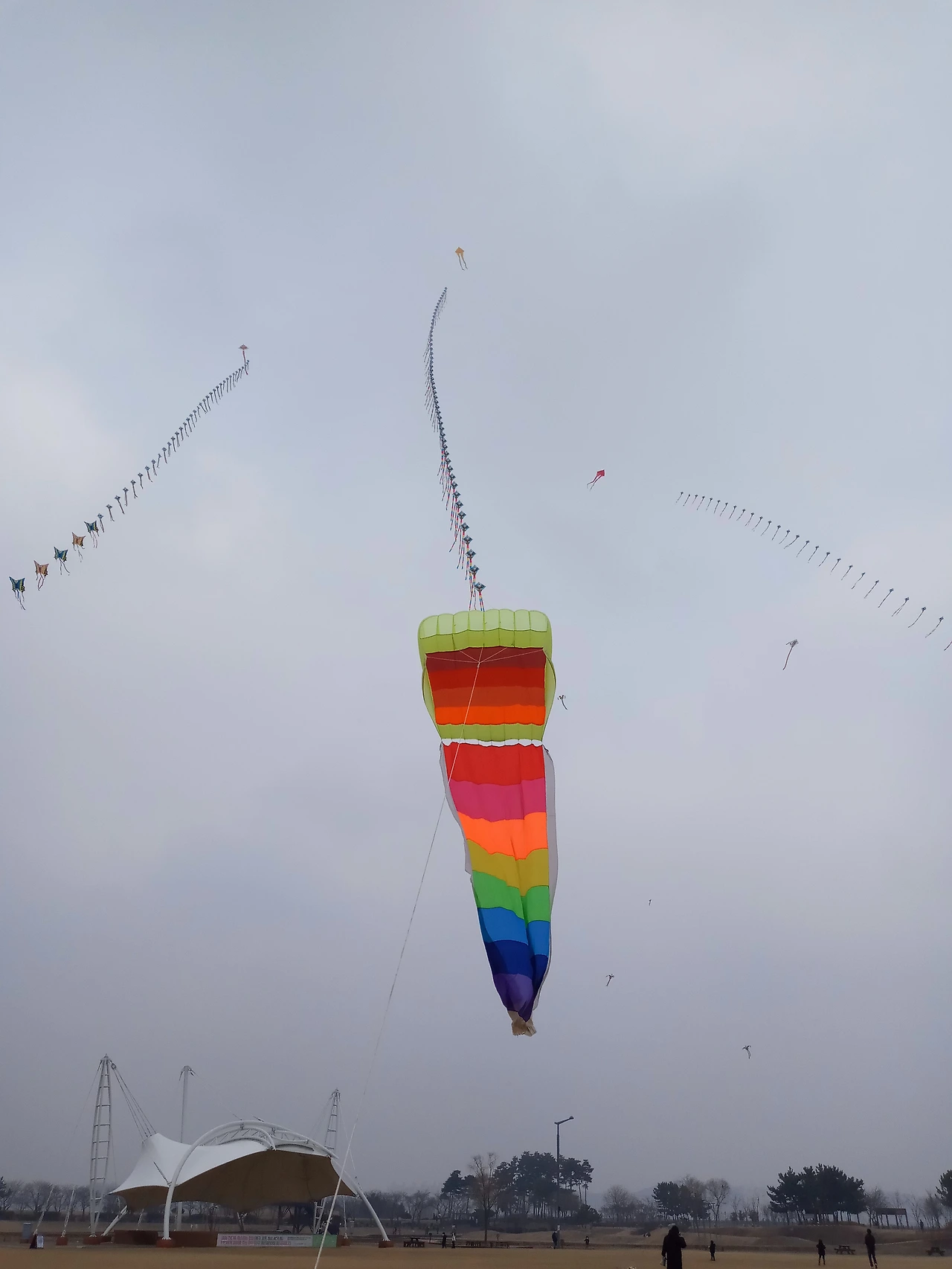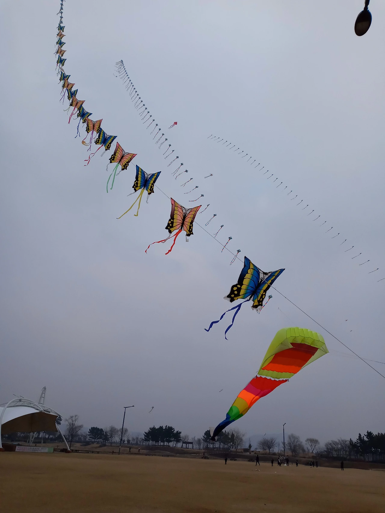 다행히 소금창고 쪽에 화장실이 있어 볼일을 보고 이런저런 이야기를 하며 주차장 쪽으로 나오니 하늘 높이 연들의 향연이 벌어지고 있다. 공원 측에서 전봇대에 묶어 날리는 연이 있기도 했지만 사람들이 가져온 연들도 높이 날기에서 지지 않겠다는 듯이 높이 날았다. 비록 하늘이 맑지 않고 흐렸지만 화려한 연의 춤사위가 내 마음까지 빼앗아 간다.