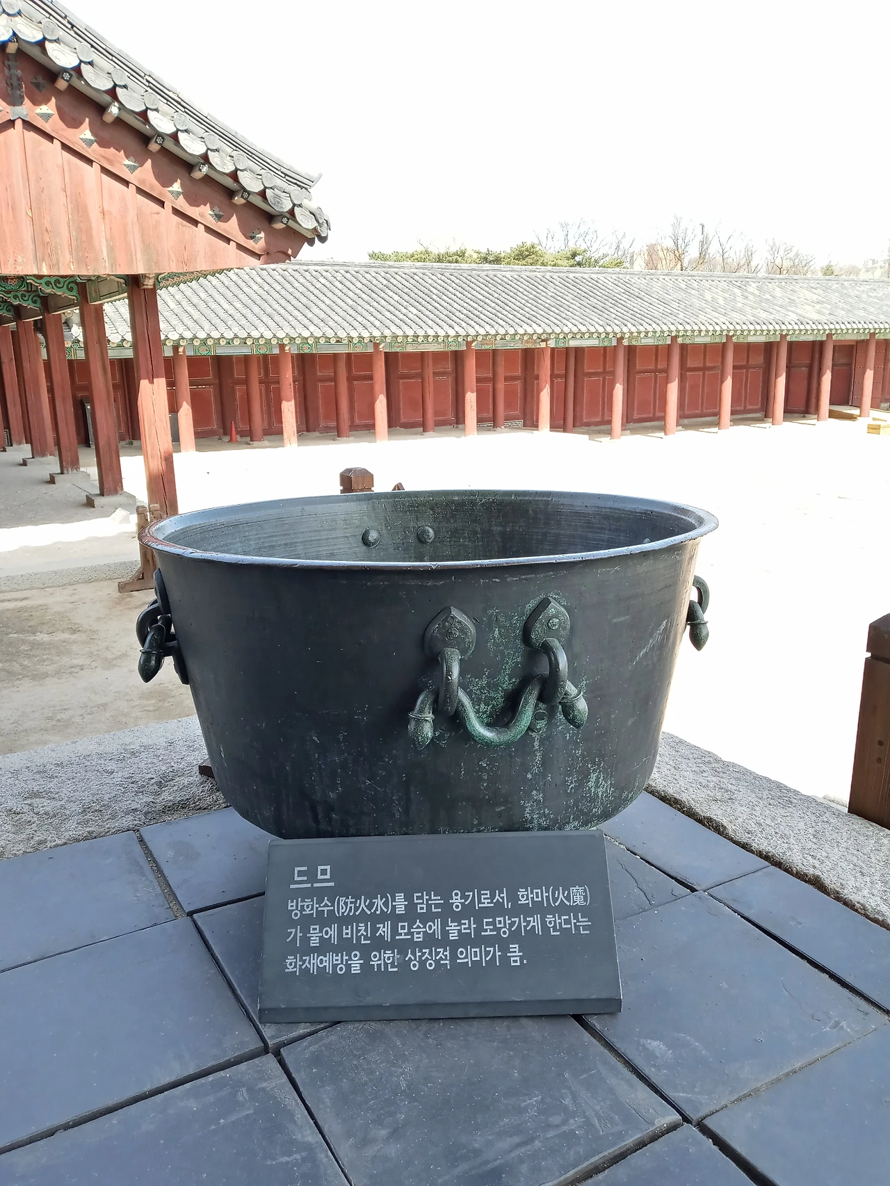 드므는 궁의 건물 귀퉁이 처마 밑에 놓여 있는데 불이 났을 때 사용하는 물을 담는 용기란다. 화마가 물에 비친 제 모습에 놀라 도망가게 한다는 화재예방을 위한 상징적 의미가 크다고 쓰여있다.