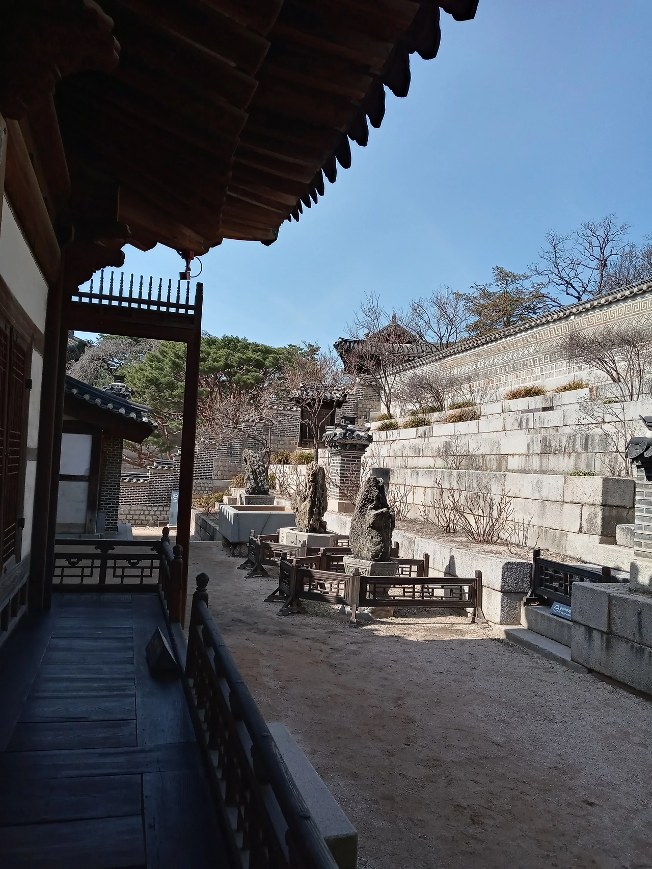 왕비가 머문다는 대조전은 용마루가 없다 한다. 지나가는 어르신이 설명해서 들었다. 용이 임금을 뜻하므로 임금을 생산하는 곳이라 용마루가 없다고 했다. 정말 쳐다보니 어색하게 민 머리 같다.