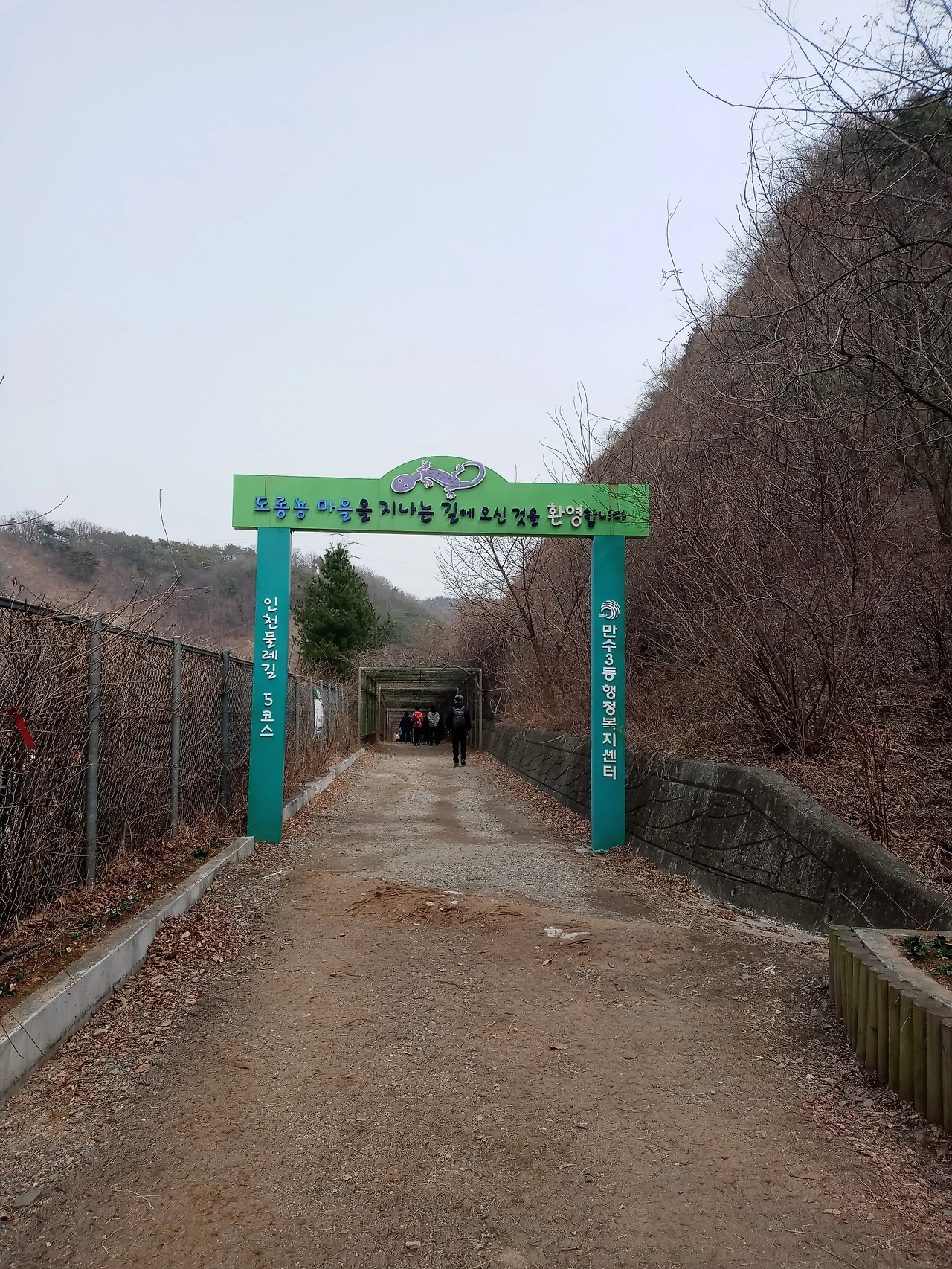 다리를 건너가니 만월산 터널이 있고 차들이 쌩쌩 달린다. 우리는 다리 밑으로 들어가 인천 둘레길 5코스라는 곳으로 들어섰다. 등나무가 멋지게 터널을 만들어 줄 것으로 예상되었다. 지금은 겨울이라 앙상한 가지만 쇠로 만들어진 터널 위에 널브러져 있다. 그리고 '도롱뇽 마을을 지나는 길에 오신 것을 환영합니다.'라는 큰 광고판을 보고 놀랐다. 설마 저렇게 낮은 산에 도롱뇽이 살기나 하겠냐는 의문을 가지고 출발했다.