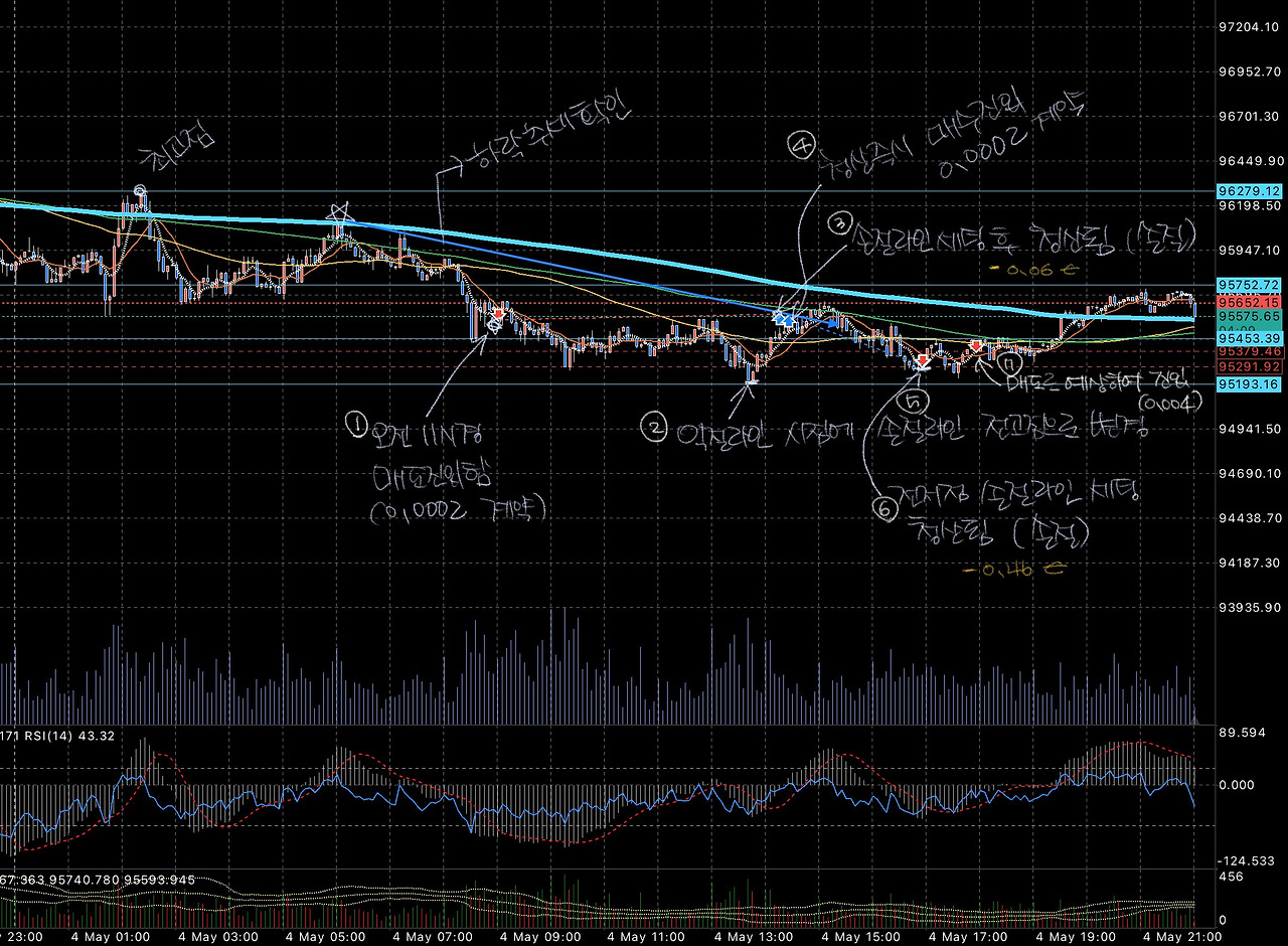 거래량이 대폭 상승했고 하락으로 긴 음봉이 나온 시점을 시작으로 추세선을 그어보니 하락추세인 것으로 예상되어 저점을 찍고 살짝 반등한 후 하락 전환 시점에 0.0002 계약으로 매도 진입에 뛰어듬.