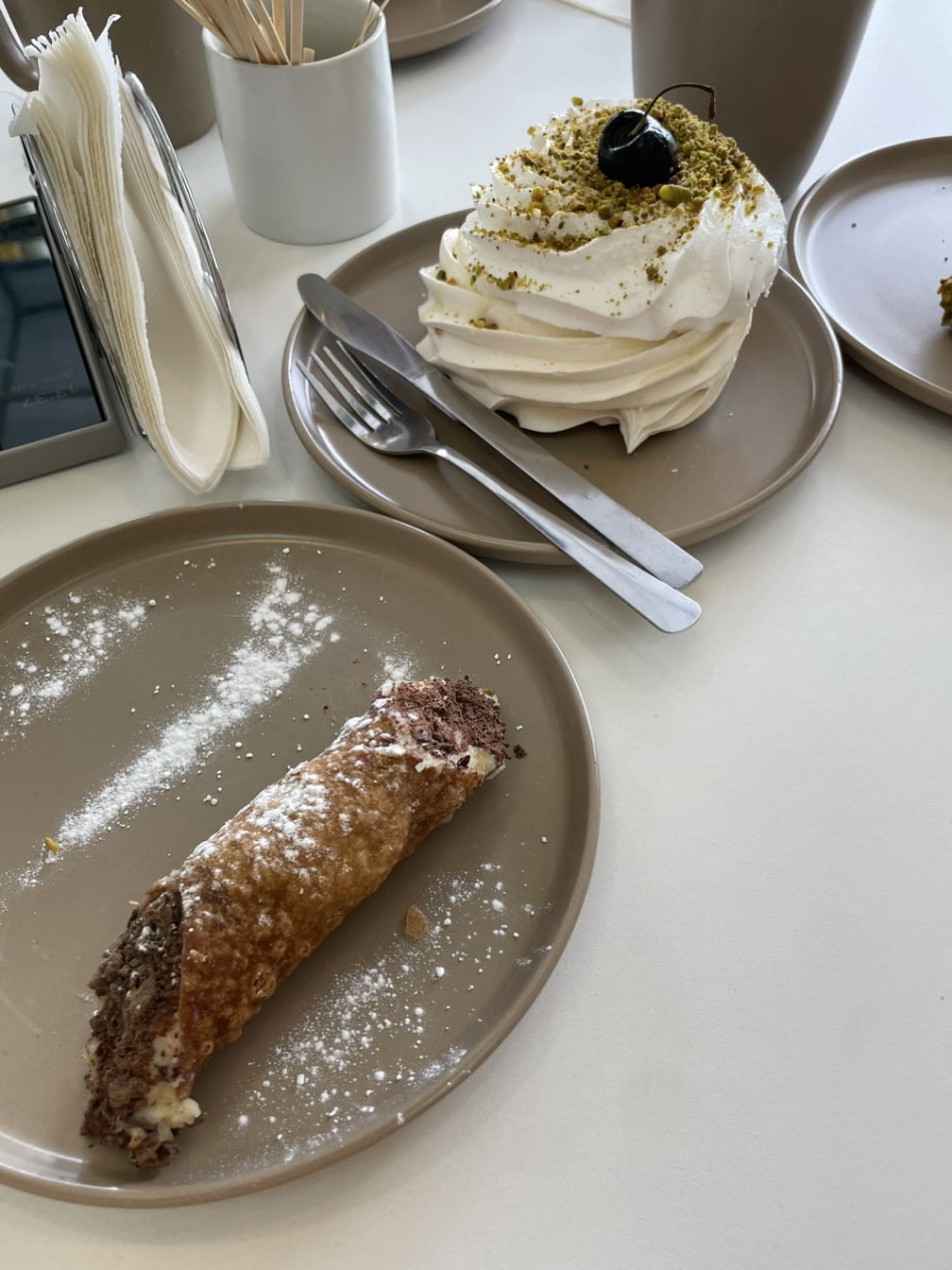 정확히 어디로 가는 것인지 모르고 출발하였는데 꽤 오래 차를 타고 가게 되어 도대체 어디로 향하고 있는 건지 궁금했다. 꽤 오랜 시간 달려 도착하여 구글맵을 열어보니 산호세가 아닌 Cartago라는 옆 지역에 도착해 있었다. 지지난주 Heredia에 이어 벌써 세 개의 주에 발자국을 찍었다! 이탈리아 디저트 카페라고 하셔서 그렇다면 무조건 티라미수지! 생각하고 있었는데 카페에 들어가 보니 티라미수는 없고 대신 카놀리(cannoli), 파블로바(pavlova), 크림으로 채운 크로와상 등을 팔고 있었다. 나는 바닐라 카놀리와 아이스 아메리카노를 주문했는데 아이스 라테를 받았다.(옆에 분이 스페인어로 대신 주문해 주신 건데 어째서?) 카놀리는 설탕코팅 된 과자로 크림을 감싼 것이었는데 이런 디저트류 자체를 너무 오랜만에 먹어서 그저 행복했다. 라테? 감사히 먹죠! 평소에 머랭 쿠키도 좋아해서 파블로바는 한국에서도 궁금했던 메뉴인데 다른 분이 주문해서 한 입 먹어볼 수 있었다.
