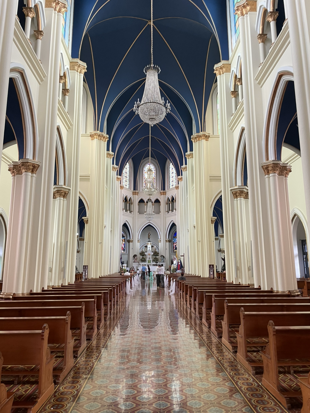 다 같이 아이스크림을 먹기 위해 시내로 나갔다. 아이스크림 가게에 도착해서 이번에는 친구 동생이 또 메뉴판 전체를 소개해줬다. 그리고 역시 결국 나 너 먹는 거..로 아이스크림 위에 크림 넛츠 시럽을 뿌린 달달달달이를 먹게 되었다. 한국이었으면 약간 걱정하였겠지만 난 지금 생활을 위한 칼로리가 필요해.. 아이스크림을 먹고 바로 건너편에 코스타리카에서 첫 고딕양식으로 지어진 성당이 있어 관광객들이 많이 찾는 곳이라고 데려가주었다. 그 앞에는 다가오는 독립기념일을 기념하여 걸린 코스타리카에서 가장 큰 사이즈의 국기가 걸려있었다.