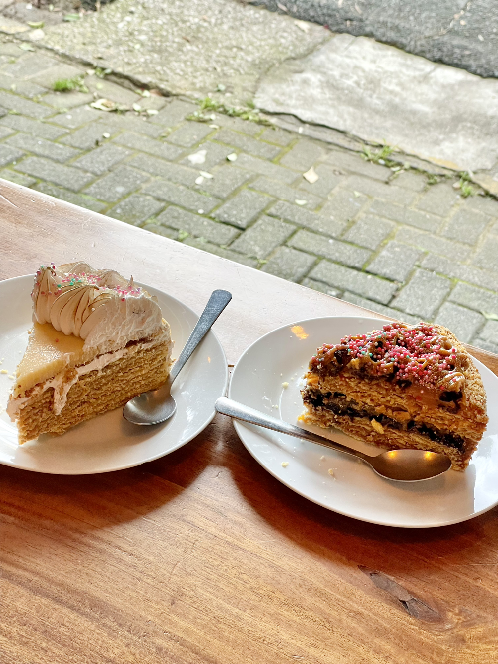 중앙 시장에 크게 볼 것은 없었지만 우연히 지난주 일요일에 친구 동생이 이야기하던 아이스크림 집을 찾았다. 무슨 맛이 있는지 물어봤는데 딱 한 가지 맛이 있다고 맛보기 스푼을 주셨다. 한 입씩 먹어보고는 하나로 나누어 먹기로 했다. 1901년에 시작한 가게로, 그냥 바닐라 맛 아이스크림인 줄 알았는데 여러 향신료(계피, 정향, 육두구, 바닐라-챗gpt가 알려줌)를 넣어서 특이한 맛과 향이 났다. 그리고서는 아까 둘러본 Barrio Escalante로 돌아가 친구가 좋아하는 카페에 가서 디저트를 먹기로 했다. 무슨 케이크를 먹을지 고민하는데-사실 나는 케이크 빵을 별로 안 좋아해서- 친구가 기왕 먹을 거면 전통적인 torta chilena를 먹으라고 추천해 줬다. 두 가지 torta chilena가 있었는데 레몬 맛은 친구가 시키길래 나는 그저 달다구리 맛으로 주문했는데 어질한 수준의 달달달달다구리였다. 뒤늦게 커피를 주문하고도 다 끝내지 못해서 포장해 집으로 가져와 먹었다. (또 집에서 먹으니까 금방 냠 먹어버렸다?) 쉽지 않은 과정을 통해 받은 relocation fee로 처음 한 것: 디저트 카페에서 torta chilena와 커피 마시기! 달달하고 의미 있고 좋다.