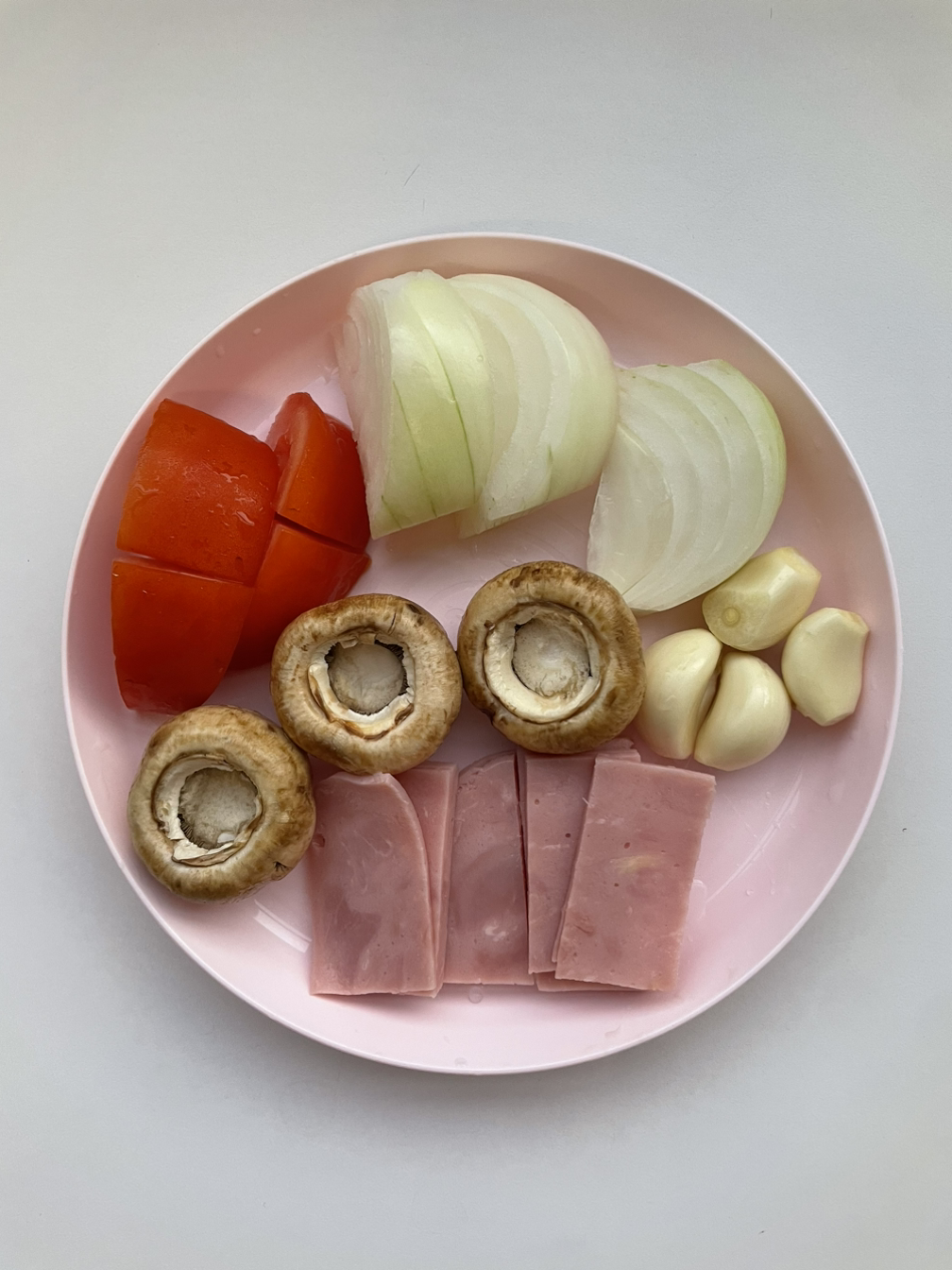마늘 까기, 양파 까기, 토마토 자르기, 버섯 씻기, 면 삶기