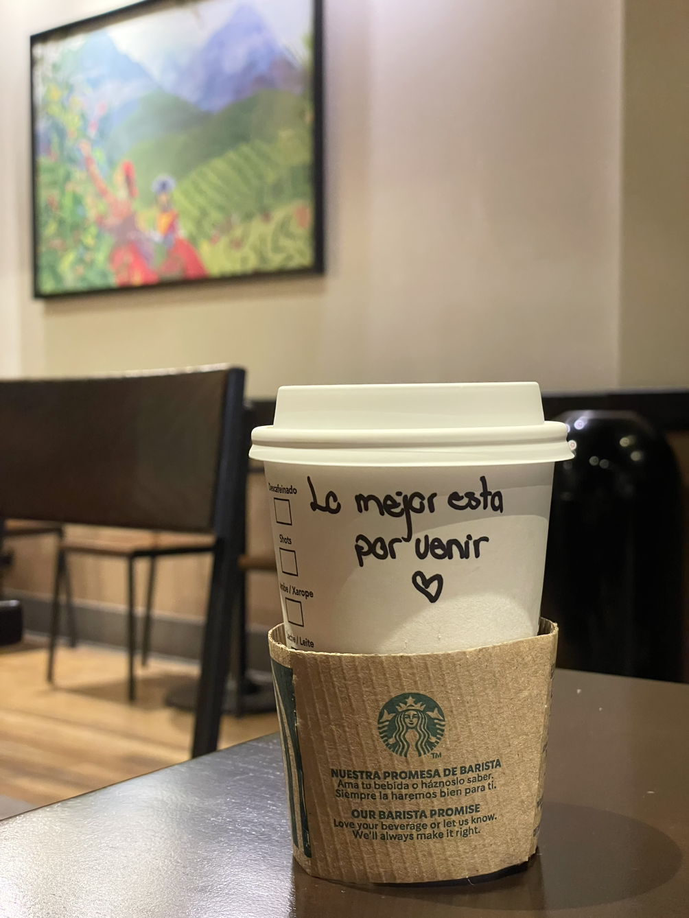9월 첫 주에 스페인어 수업을 시작한 뒤로 하루도 빠짐없이 수업이 있었는데, 오늘 처음 Día del Respecto a la Diversidad Cultural라는 아르헨티나 공휴일로 프로페소라가 쉬어야하니 수업이 없었다. 다른 나라에 있는 한국분들이 각 나라 공휴일보다 아르헨티나 공휴일이 더 기다려진다고 말씀하시는 이유가 있었다. 집으로 돌아와 점심을 먹고 외출 준비 후 어제 실패한 카페로 걸어가려는데 또다시 비가 왔다. 그래서 오늘도 또타벅스행. 어제에 이어 오늘도 오늘의 커피 한 잔 주세요~하고 에스더용! 하려는데 알바 언니가 (아마 언니가 아니었겠지) 내 이름을 기억해 줬다. 그렇게 받아 든 컵에는 'Lo mejor esta por venir♡(더 좋은 일들은 아직 오는 중..?이라고 이해함.)'이라고 적혀있었다. 나에게만 적어준 것은 아니겠지만 그래도 덕분에 따뜻한 마음으로 빈 시간 사이에 밀린 일기를 작성하기 시작했다.