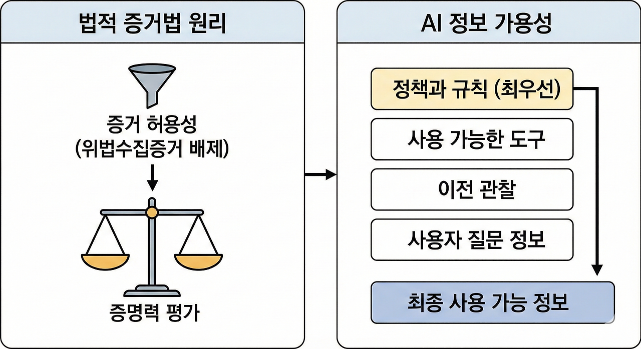 이것은 증거의 허용성 판단과 유사합니다. AI가 사용할 수 있는 정보 소스는 제한되어 있고, 그 제한 내에서 가장 증명력 있는 정보를 찾아야 합니다. "정책 규칙이 최우선"이라는 원칙은, 법적으로 말하면 "증거의 허용성이 증명력보다 먼저 검토되어야 한다"는 것입니다.