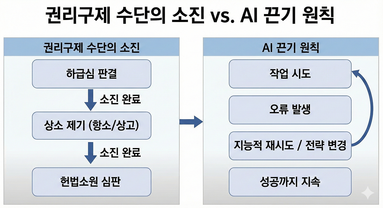 이것은 "권리구제 수단의 소진"과 구조적으로 동일합니다. 하나의 경로가 막혔다고 바로 포기하지 말고, 다른 경로를 시도하라. 단, 같은 실패를 반복하지 말고 전략을 바꾸라는 것입니다.