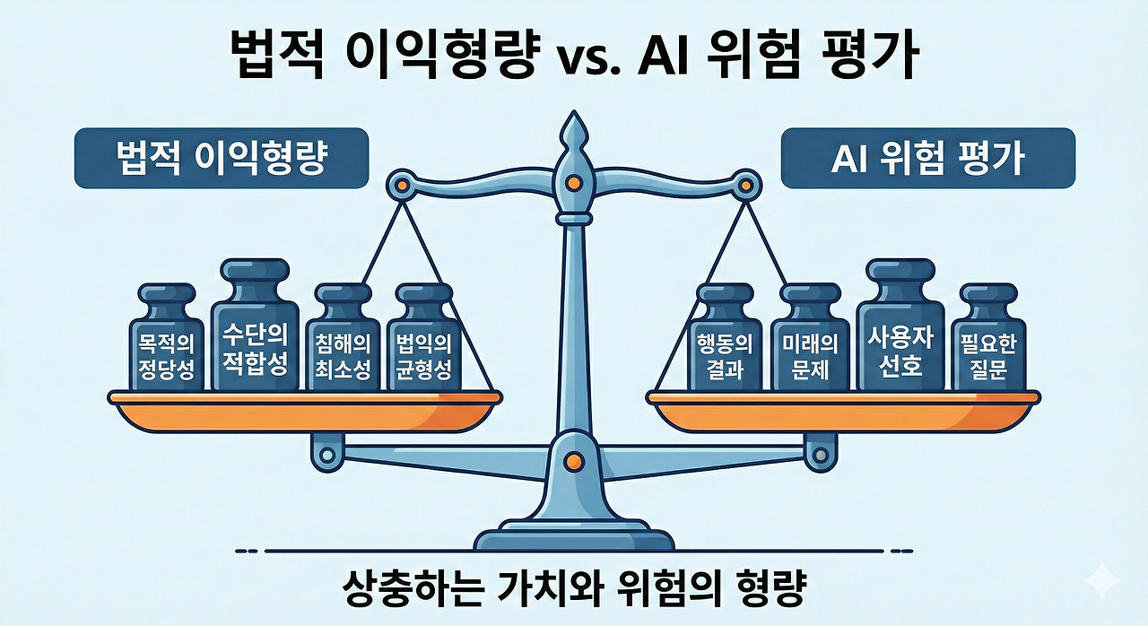 이것은 이익형량의 구조와 유사합니다. 목적(사용자 요청 충족)과 위험(잘못된 행동의 결과) 사이에서 균형을 찾는 것입니다. "침해의 최소성" 원칙은 AI 프롬프트에서 "사용자에게 불필요한 확인 질문을 하지 않는다"는 지침으로 나타납니다.