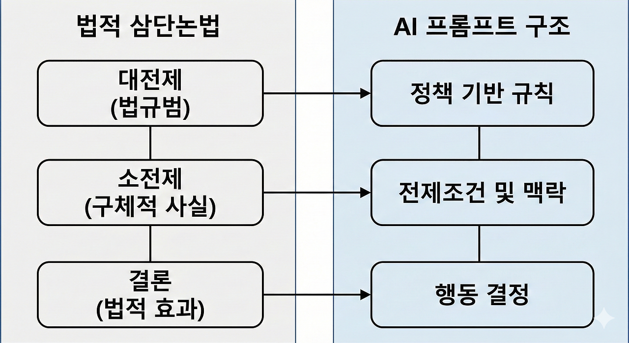 이것은 법적 삼단논법의 구조와 정확히 대응합니다. 정책 규칙은 대전제(법규범)에, 전제조건과 사실 확인은 소전제(포섭 과정)에, 최종 행동 결정은 결론(법적 효과)에 대응합니다.