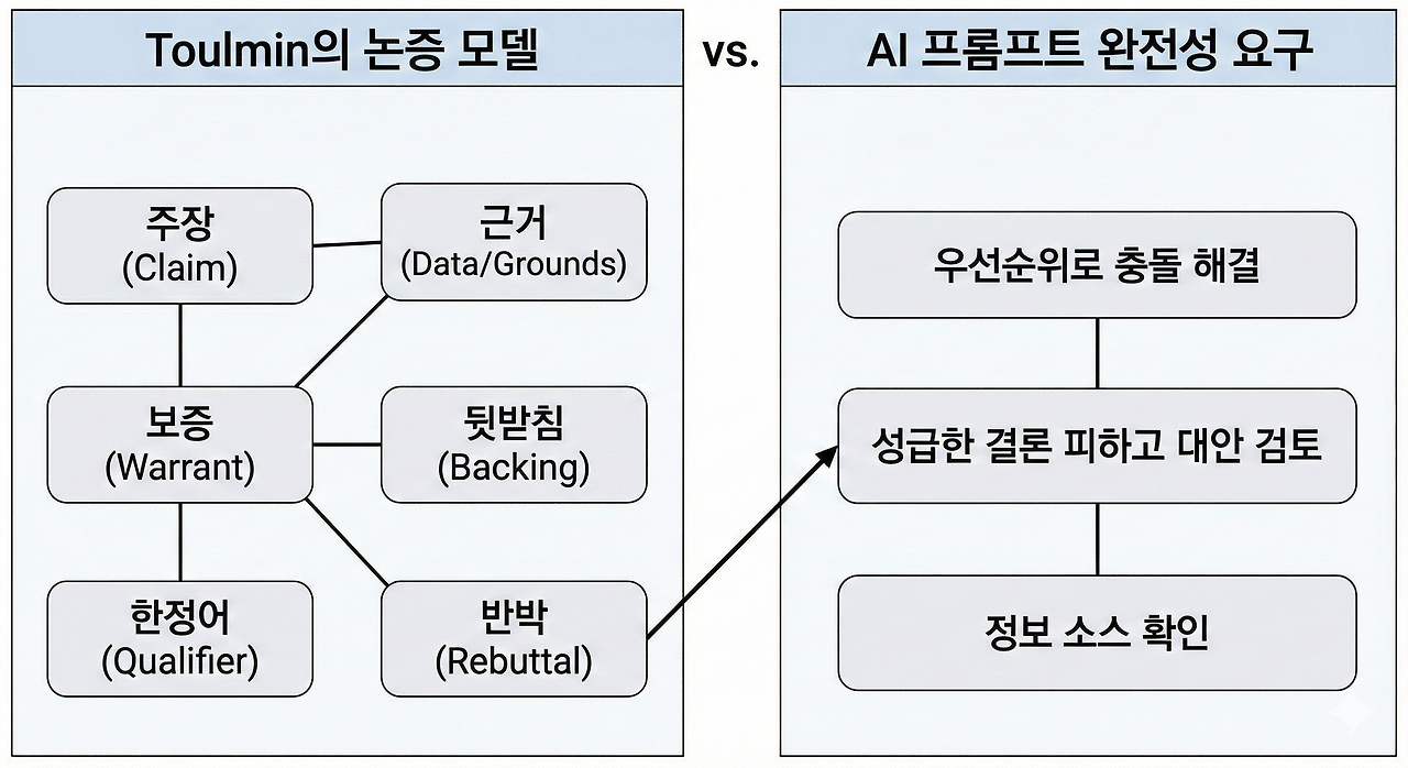 법적 논증 이론에서 자주 인용되는 Toulmin 모델은 논증의 구조를 여섯 가지 요소로 분석합니다. 주장(Claim), 근거(Data/Grounds), 보증(Warrant), 뒷받침(Backing), 한정어(Qualifier), 반박(Rebuttal)이 그것입니다.