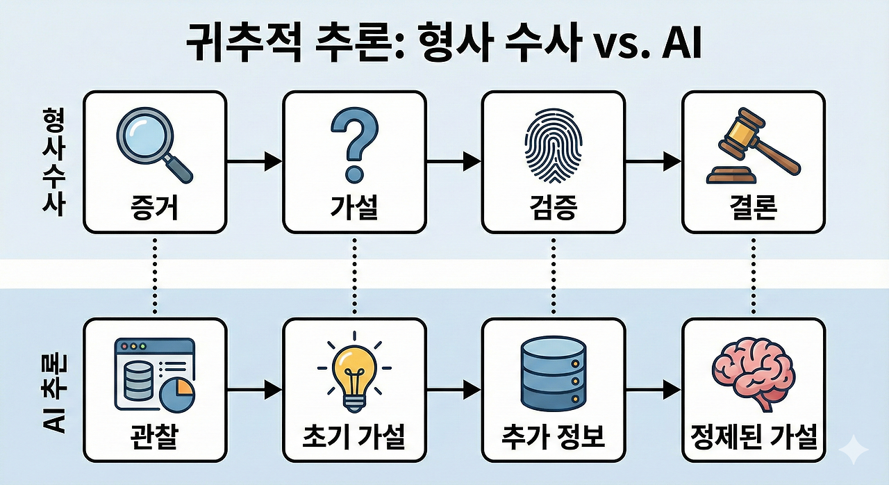 검사와 수사관의 사고방식은 본질적으로 귀추적(abductive)입니다. 범죄 현장의 증거들(결과)을 보고, 가장 그럴듯한 설명(원인, 즉 범행 경위)을 추론합니다.
