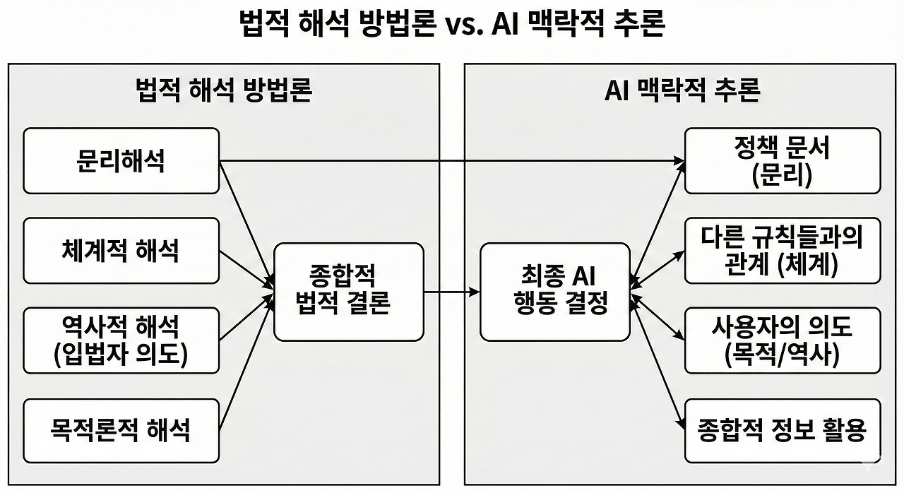 AI 프롬프트는 여러 정보 소스를 "종합적으로" 활용하라고 지시합니다. 정책 문서(문리해석에 대응), 다른 규칙들과의 관계(체계적 해석에 대응), 사용자의 의도(목적론적 해석에 대응)를 모두 고려해야 합니다.