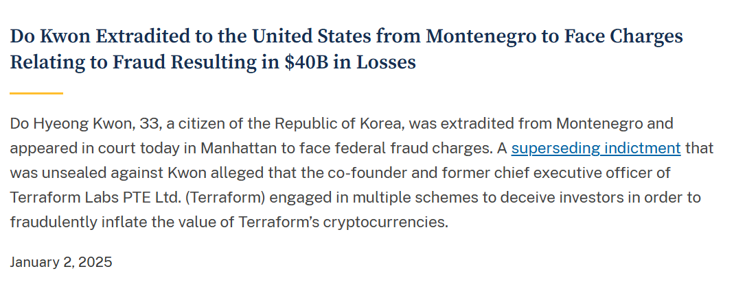 미국 법무부 사이트를 방문하면 아래처럼, 새해 벽두인 1월 2일자로 기소된 테라루나 사건에 대한 공소장을 바로 볼 수 있습니다.