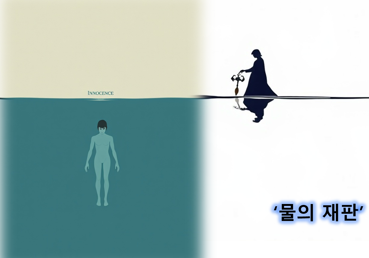 이미지는 신판 중 '물의 재판'을 표현한 것이다. 신성한 물에 빠뜨려 가라앉아 받아들여지면 무죄지만 익사하고, 떠오르면 신성한 물이 거부하였으니 유죄로 사형에 처해진다.
