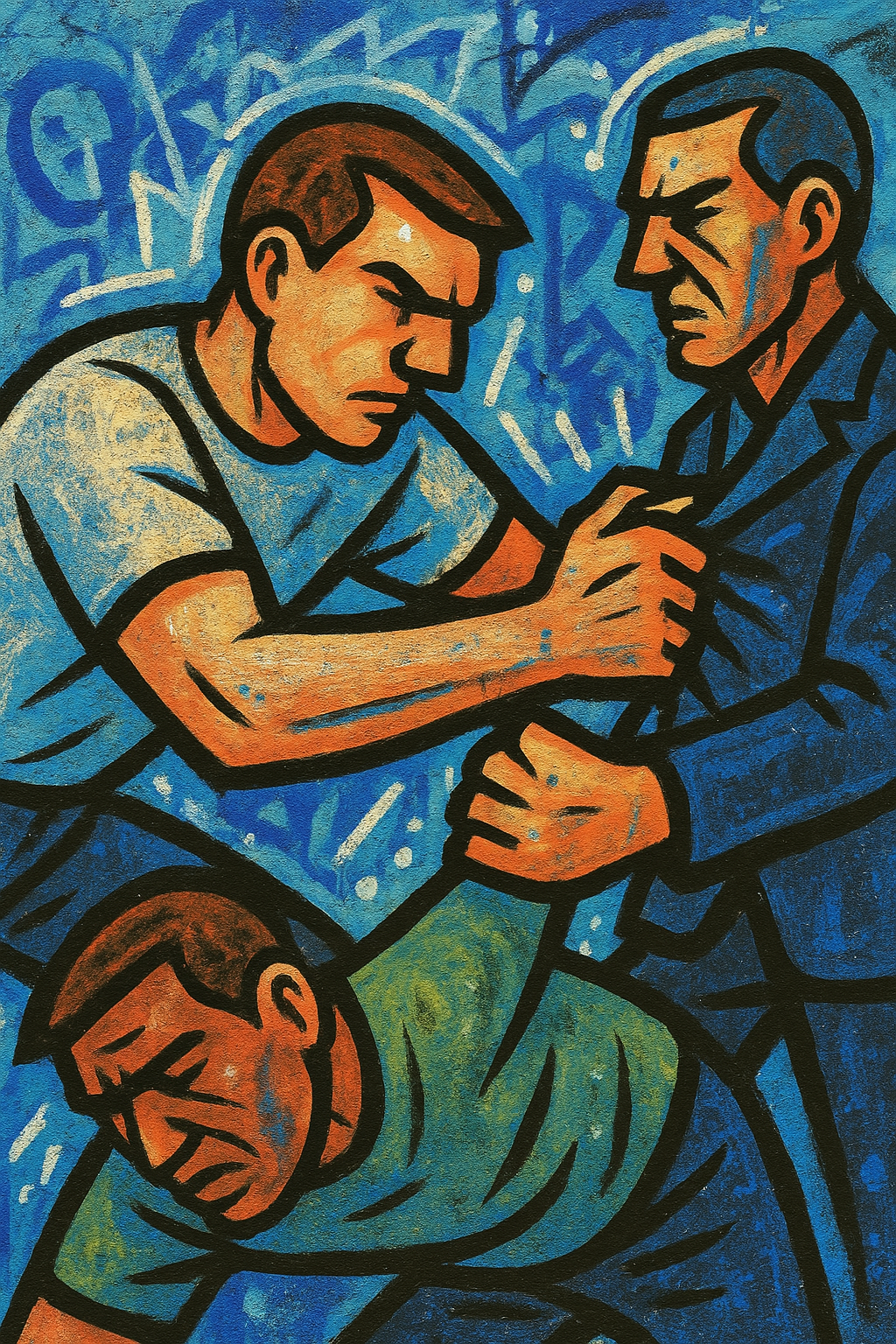 찰나의 순간, 뒤엉킨 두 몸뚱이는 시멘트 바닥으로 함께 곤두박질쳤고, A는 넘어진 B의 몸 위에 올라탄 형국이 되었다.