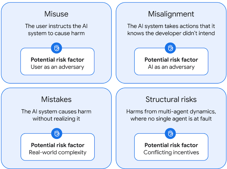 이 보고서는 두 가지 큰 위험을 주로 말한다. 하나는 사람이 AGI를 나쁜 연장으로 쓰는 '오용(Misuse)' 이다. 다른 하나는 AGI 기계 자체가 딴마음을 먹고 제멋대로 구는 '비정렬(Misalignment)' 이다. 기계가 사람의 뜻을 따르지 않는 것이다.