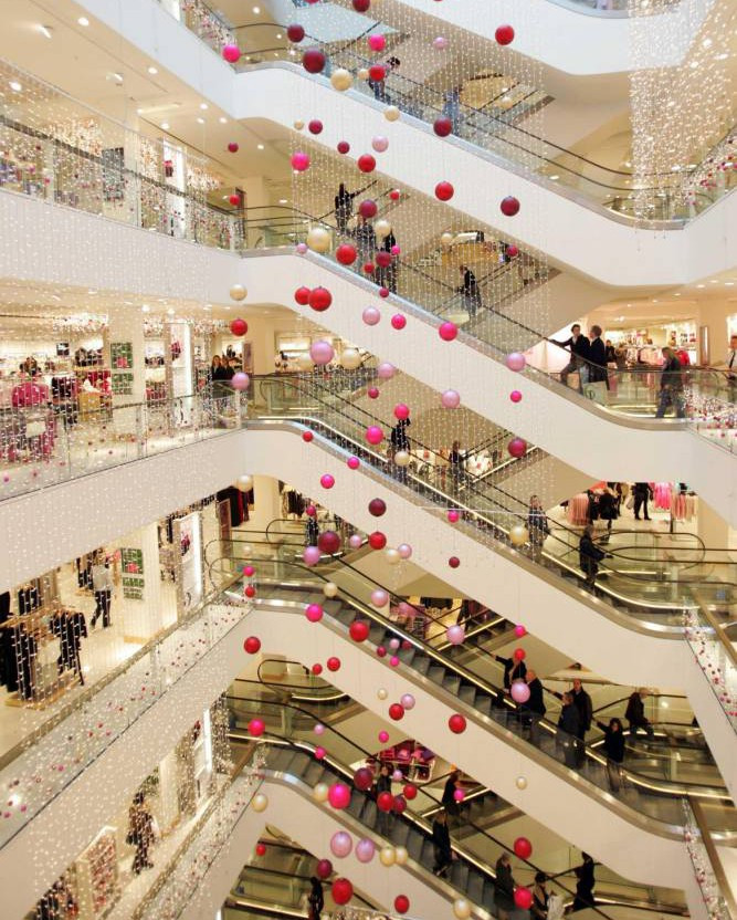 에스컬레이터를 타고 가면서 계속 물건을 보게 하여 구매를 유발하기 위한 것이다.