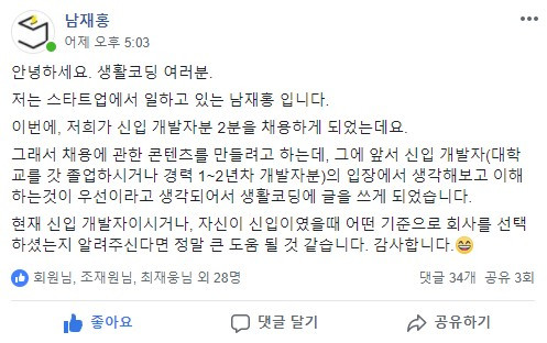 관심이 있는 신입 개발자, 동료를 모집하기로 하였다.