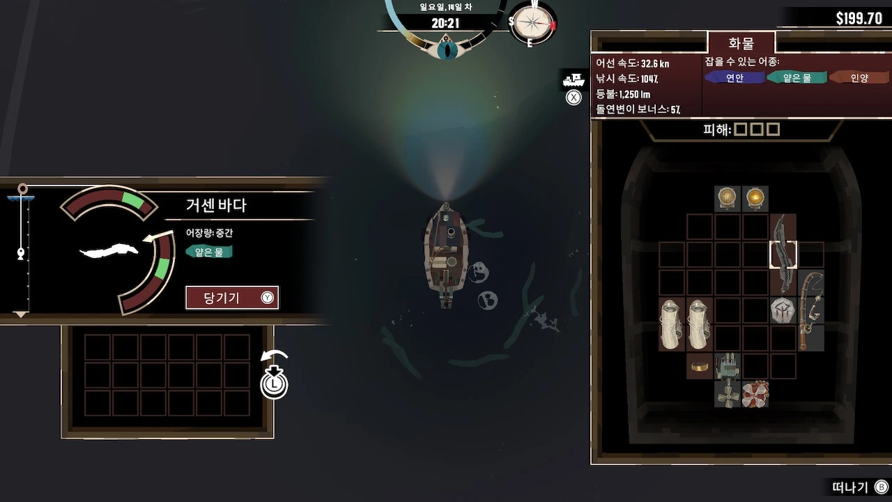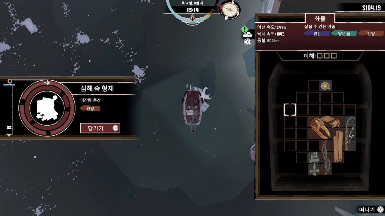 모든 해산물과 물건은 선박 화물칸과 마을 창고에 보관될 때 저마다 칸 형태가 정해져 있다. 테트리스를 하듯 물체를 이리저리 돌려가며 창고의 칸 개수와 형태에 들어맞게 차곡차곡 쌓아야 한다. 덩치가 큰 물고기를 싣기 위해선 화물칸이 커야 하므로 선박 강화 재료를 꾸준히 수집할 필요가 있다.