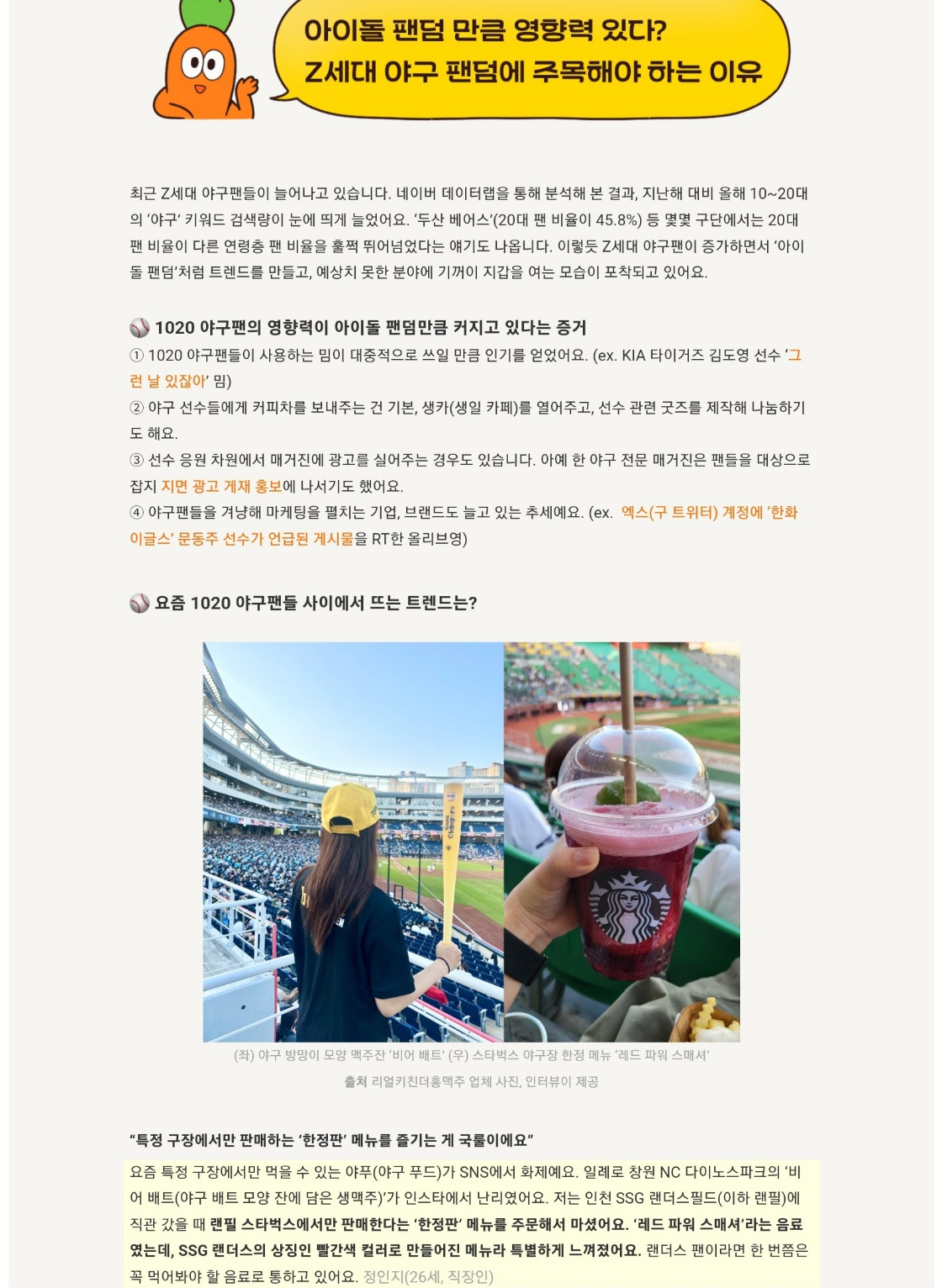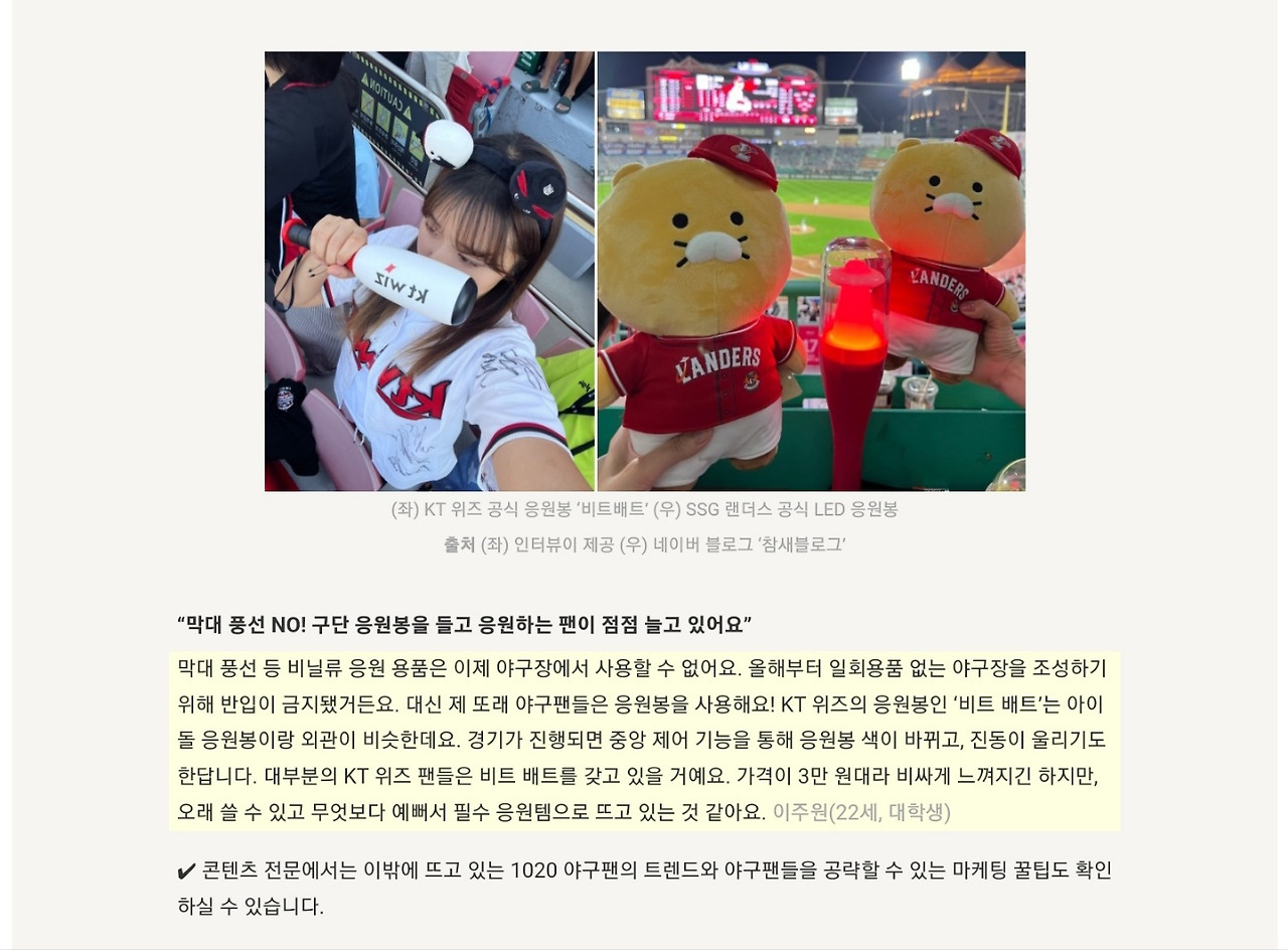 올해, 프로야구 창단 이래 처음으로 전반기 600만 관중을 돌파했다고 해요. 특히, 젊은 여성과 MZ세대 팬층이 증가했다는 특징이 있는데요. 2024 KBO 올스타전 팬 예매 비율만 봐도 2030 여성 비율이 58.7%로 가장 높은 비중을 차지했어요. 그리고 주변 지인을 통해 들은 얘기로는, 야구 티겟이 비싸지 않기 때문에 10대 청소년들이 부담 없이 구매할 수 있어서 야구장에 가는 게 하나의 유행이라고 해요. 야구는 중장년층에게 인기 있는 스포츠라고 생각했는데, 그렇지 않았던 것이죠.