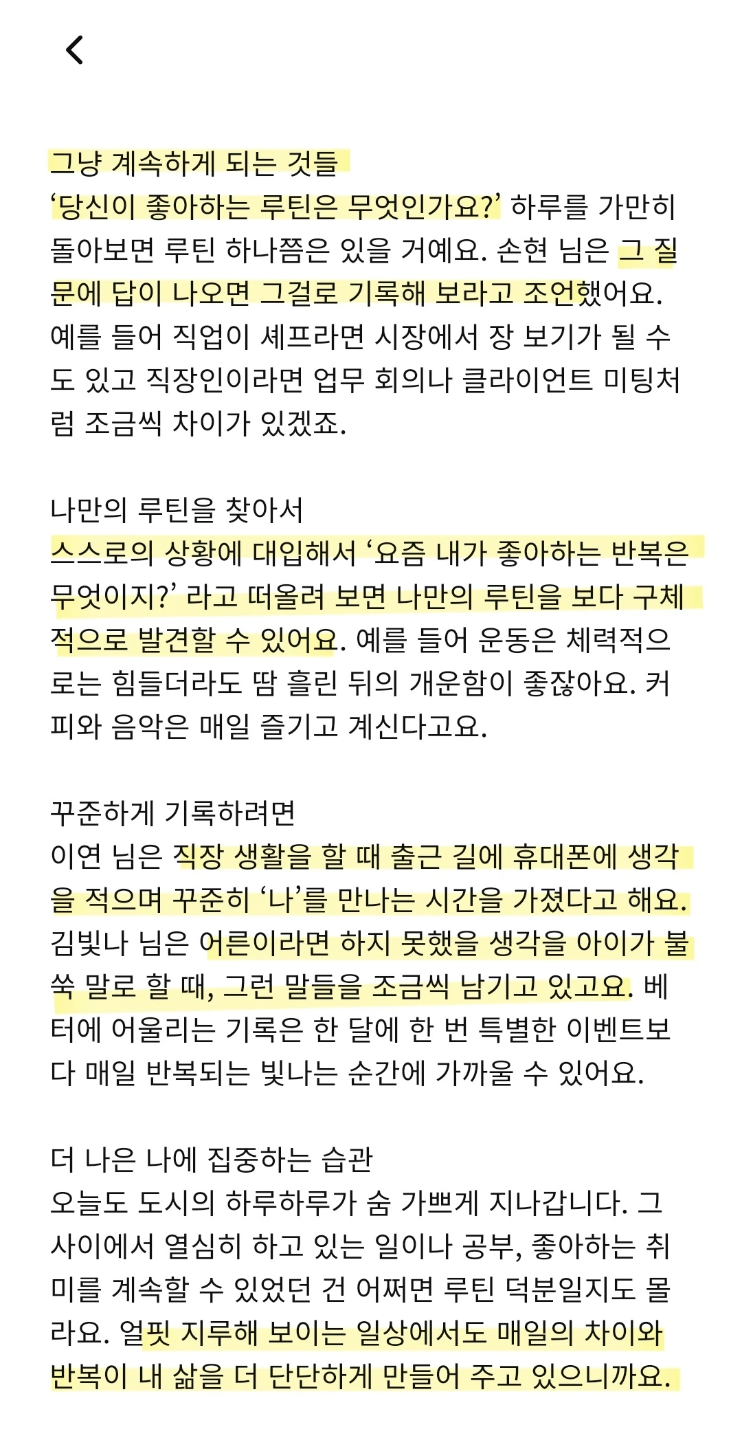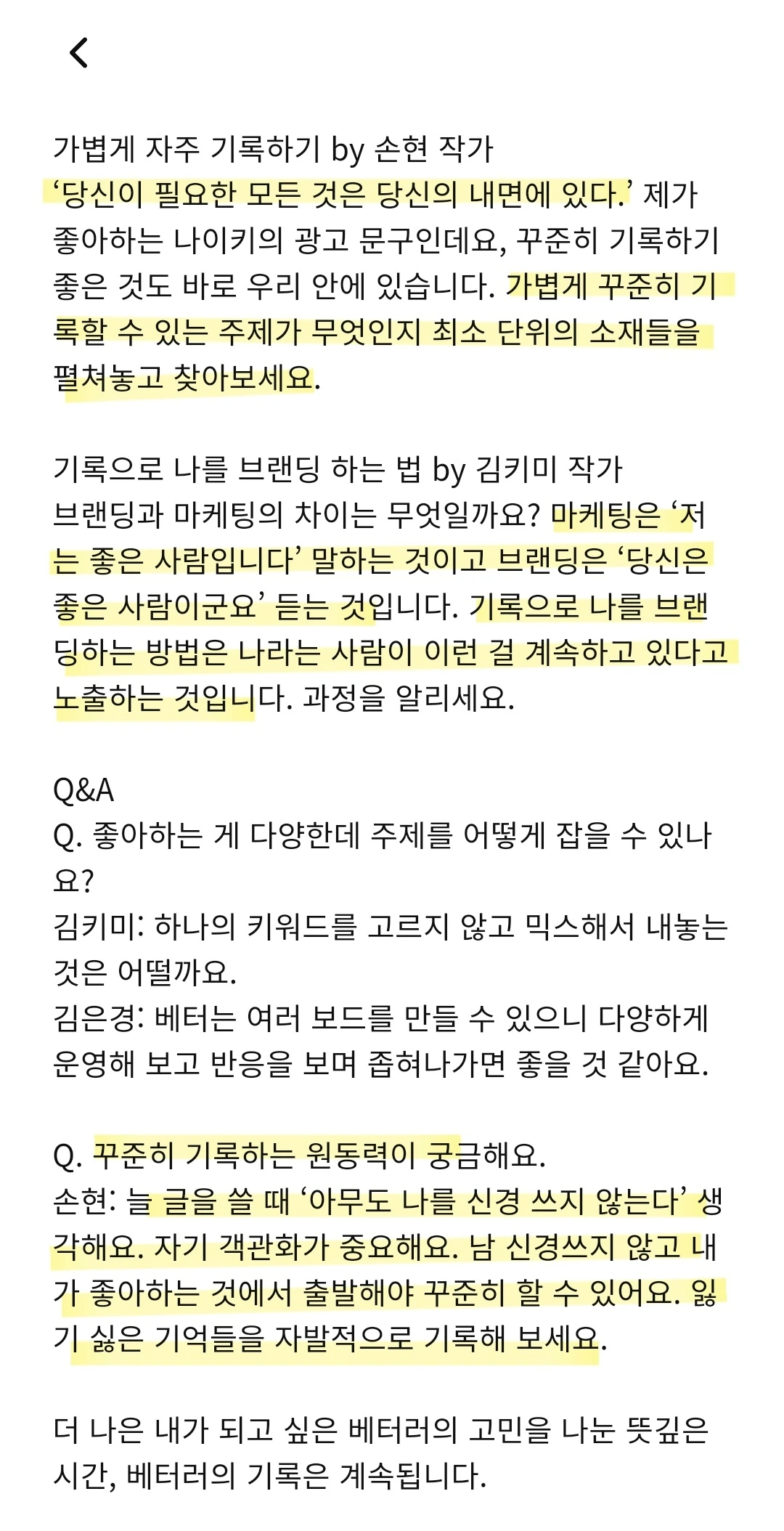 여기서 기록은 이를 도와준다. 기록하기 전 나의 관심사를 생각해 보게 되고, 그것을 기록함으로써 견고한 취향이 만들어진다.