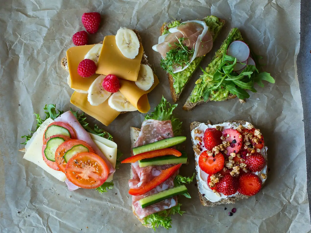 토핑의 종류는 여러가지이고, 무엇을 어떻게 함께 먹느냐가 관건이다. 우선 고기 쪽으로는 소고기, 돼지고기, 닭고기, 칠면조 등을 편육으로 만든 햄 종류나 (노르웨이어로 skine. 사진 한 중간 아래 쪽에 있다), 페퍼로니와 같이 썰린 소세지나 살라미 종류, 그리고 소금에 절이고 건조하여 얇게 저민 하몽과 비슷한 햄 (dry-cured ham; 노르웨이어로 spekeskinke)가 있다.