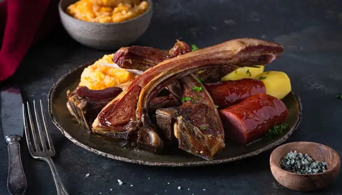 한국인에게 삼겹살이 있다면, 노르웨이인에게는 ribbe가 있다. 자르지 않은 두꺼운 옆구리 삼겹살을 갈빗대가 붙은 채로 한꺼번에 통으로 오븐에 구워, 껍데기를 바삭하게 만드는 ribbe [립베]는 노르웨이 전통 음식 중 단연 최애라고 말할 수 있다. 위키피디아에 따르면 노르웨이 내 크리스마스 밥상의 60% 정도를 차지할 정도로 널리 사랑받는 음식이라고 한다.