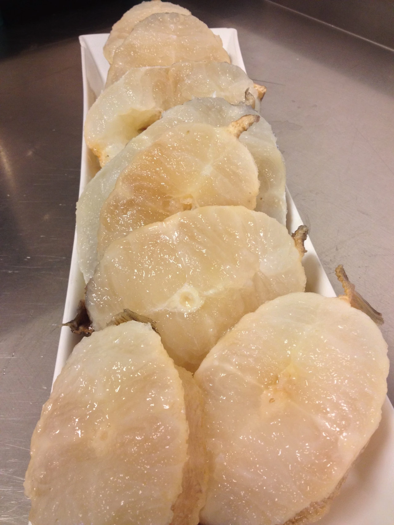 물론 그대로 먹을 수는 없다. 5-6일이상 매일 물을 갈아주면서 물에 담가 불린 다음에, 이틀 정도 더 물을 갈지 않는 상태로 약간의 가성소다(잿물)이 든 물에 다시 불려야 한다고 한다. 이 과정을 거치면서 말렸던 생선이 다시 부피가 커지고, 단백질의 50% 정도를 잃으면서 젤리같이 탱글탱글한 식감이 완성된다.