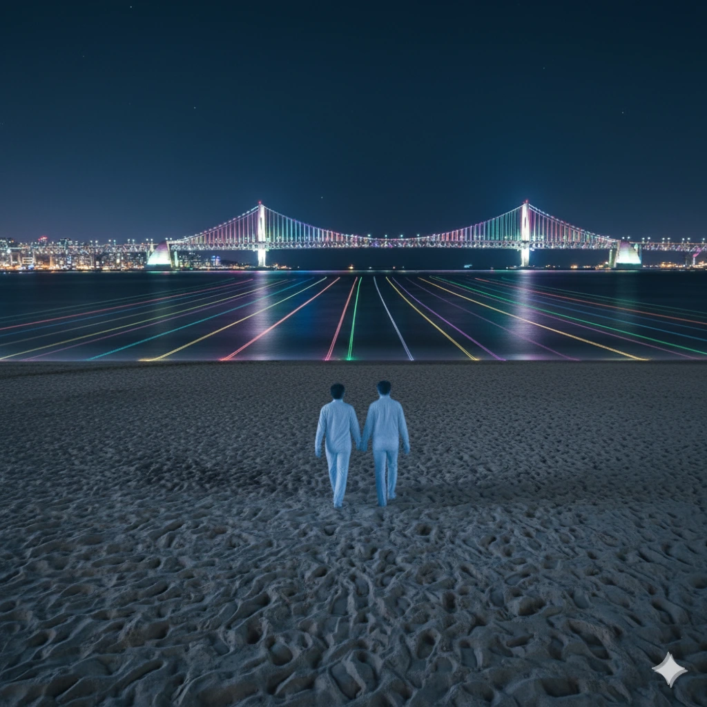 우리는 조용한 카페를 찾아봤지만, 저녁 시간이라 어디든 사람이 넘쳐났다. 마침, 광안대교가 점등됐길래 백사장에 가보기로 했다. 영롱하고 알록달록한 빛의 파장들이 바다 위로 갈래갈래 뻗어나가고 있었다.