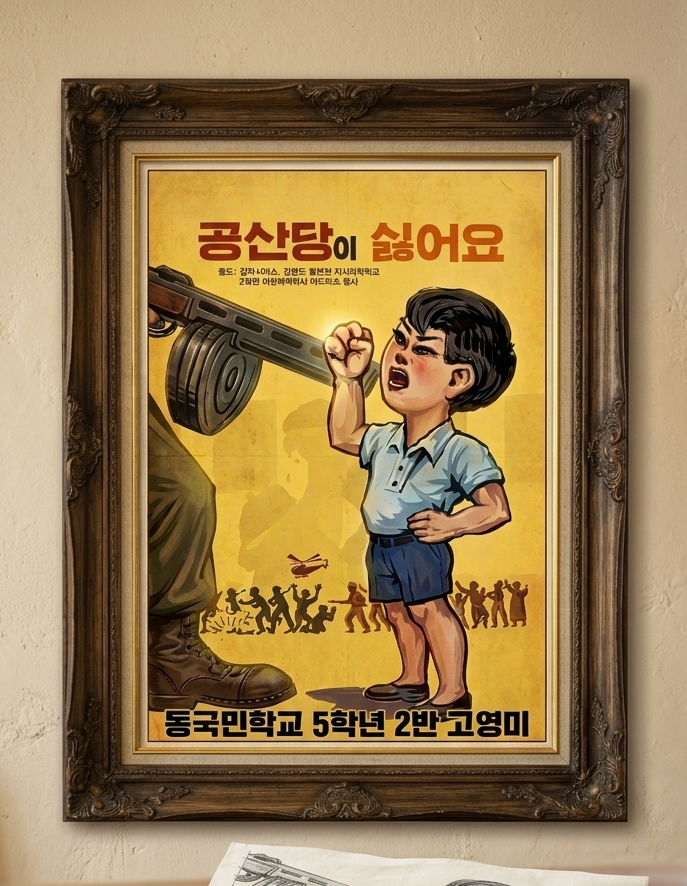 훈화시간이 끝나고 교실로 들어오는 복도에는 며칠 전부터 학생들이 그려낸 반공(反共) 포스터들이 보였다. 도화지 위에는 붉은 피를 뚝뚝 흘리는 듯한 거대한 괴물이 하얀 한반도를 삼키려는 형상이 거칠게 그려져 있었다. 괴물의 눈은 번뜩였고 날카로운 이빨은 금방이라도 무엇인가를 물어뜯을 듯 기괴(奇怪)했다. 포스터 아래에는 ‘무찌르자 공산당’, ‘이룩하자 조국 통일’과 같은 붉고 검은 글씨들이 비명처럼 새겨져 있었다.